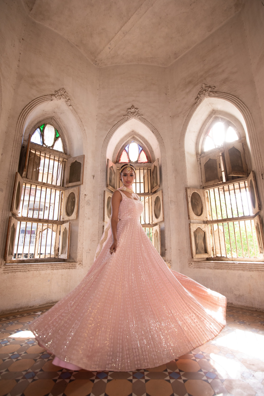This look features a champagne blush anarkali gown set. The sleeveless ensemble has a square neckline with a back cutout at the waist. It is embroidered all over with sequins and thread and paired with a matching net dupatta with embroidered scallop lace and bootis to complete the look.