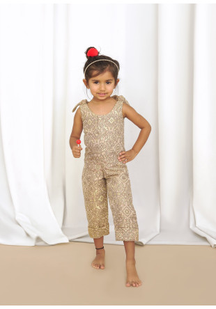 Gold brocade jumpsuit with shoulder-ties and side pockets
