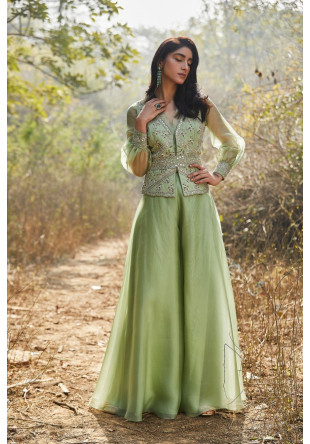 Mint green organza sharara pants paired with an organza shirt, hand embroidered jacket and belt