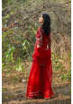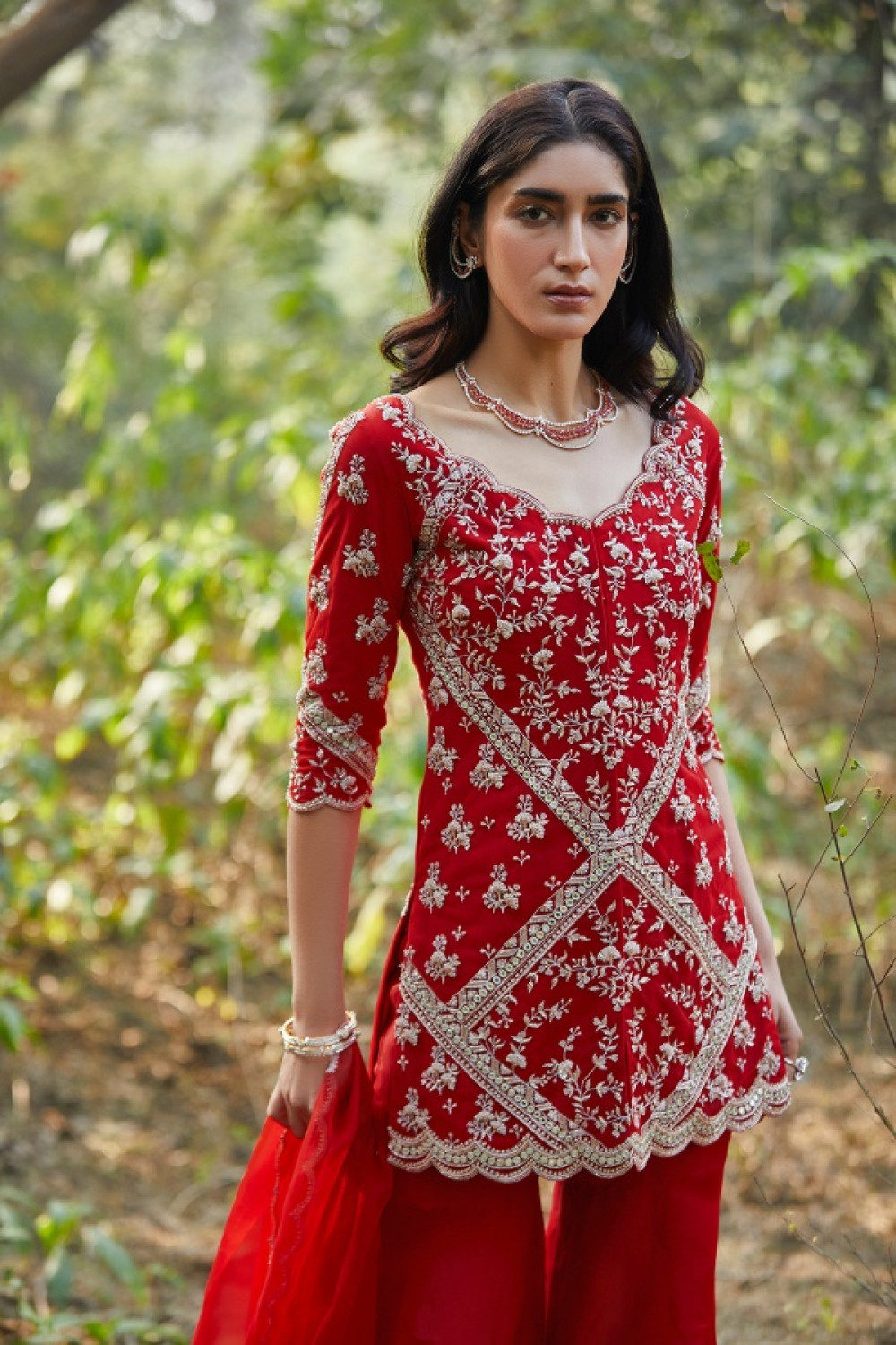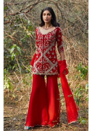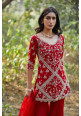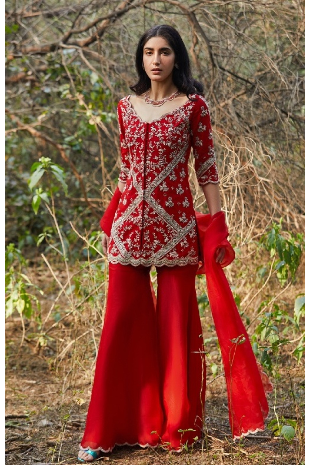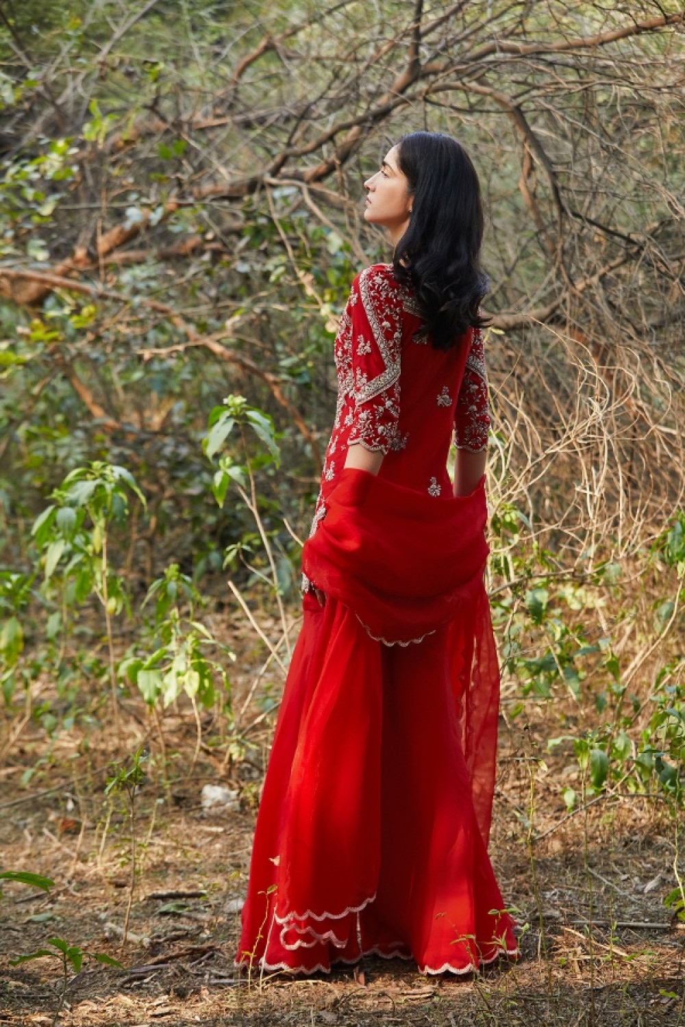 Traditional red georgette pants paired with hand embroidered jacket and organza dupatta