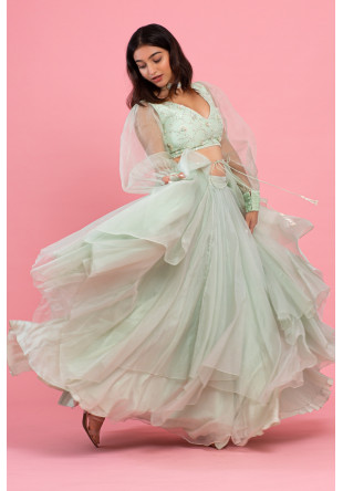 Mint-green peplum top in organza with 3D embroidery in glass beads, sequin and pearl with an asymmet.....