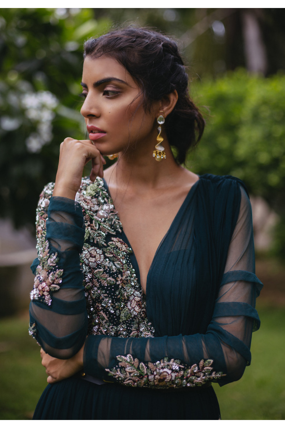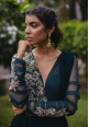 Zara - dark green anarkali gown in georgette with cutdana, and sequins embroidery on the front and back with net sleeves and sheer back. Includes dupatta attached at shoulder and leather belt.