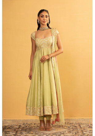 Bottle gourd anarkali with gota-work paired with a net dupatta and chudidhar pants in crepe