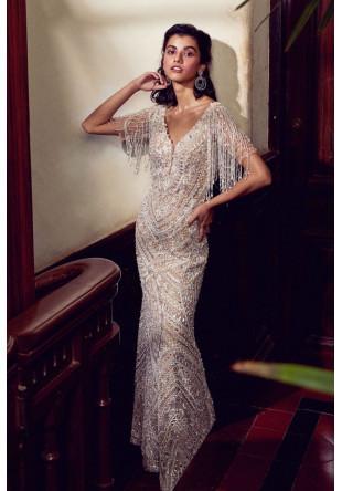 Tags: Nude fitted gown with hand embroidered white pearls and tassels