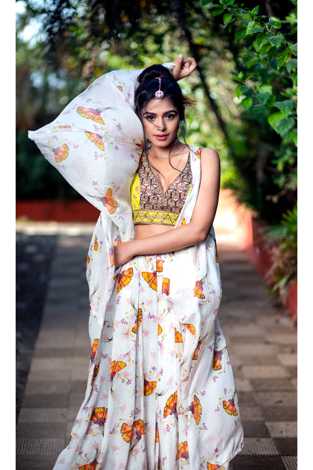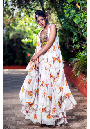 Off-white floral printed, pleated 2 layered skirt with cutwork paired with a lime green blouse blouse with antique gold embroidery and gota embellishment and a draped cape