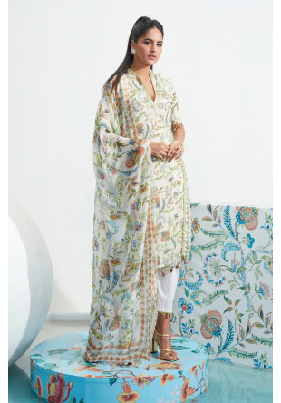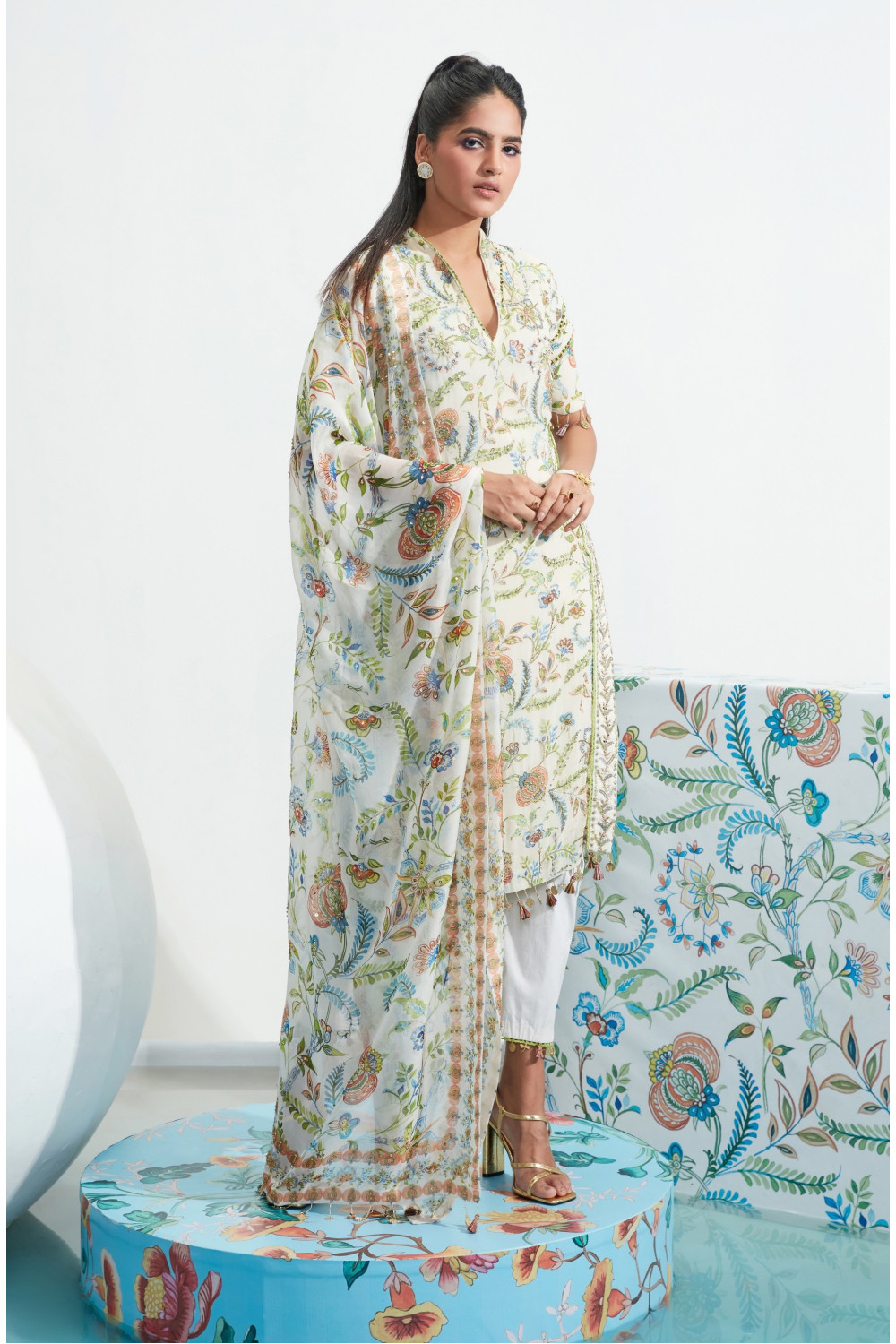Ivory georgette embroidered kurta paired with cotton lycra pants and an embroidered organza dupatta with tassel details at the hem