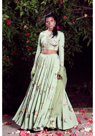 Light blue overlap blouse with embellished straps with gold floral handwork and palazzo pants with pleated net side panels and a georgette dupatta with a gold metallic buckle detail