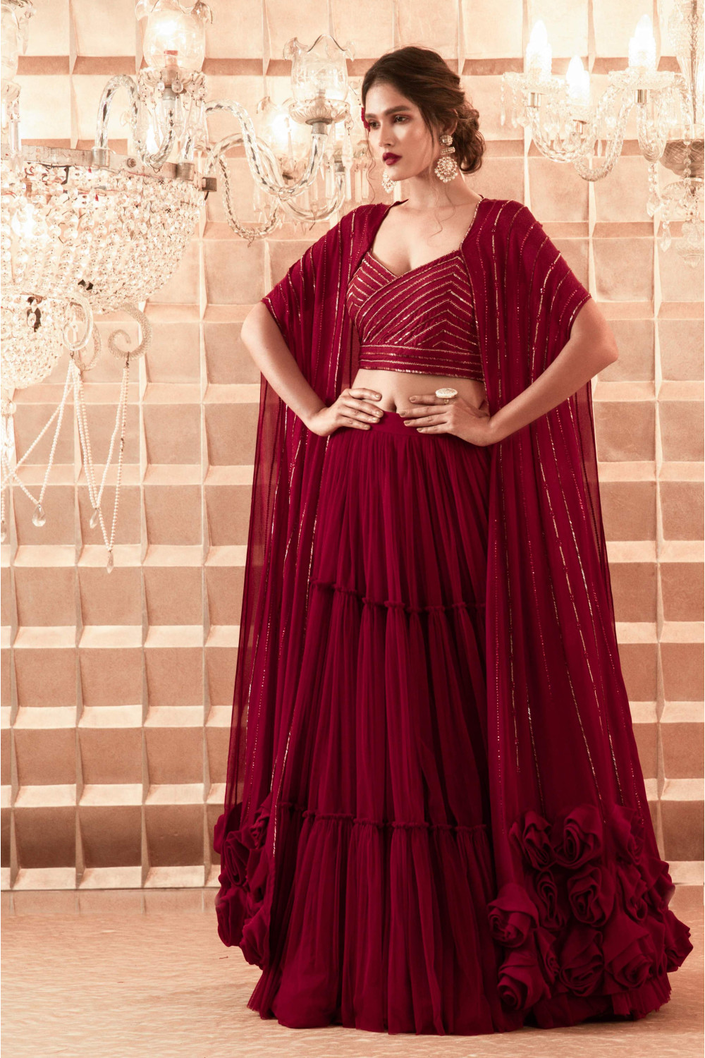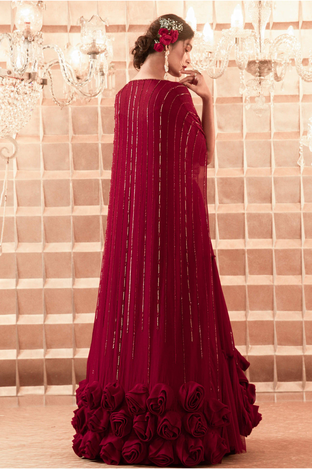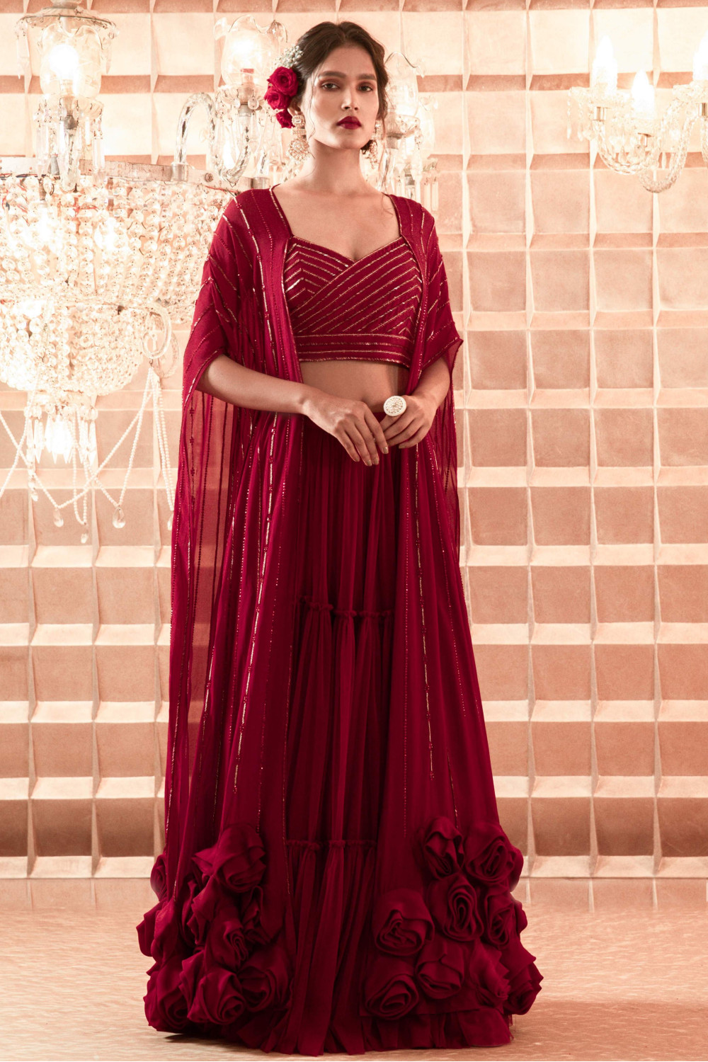 Oxblood hand embroidered paper-silk kimono with crepe rose detailing and a gathered net skirt with a silk bustier.