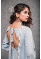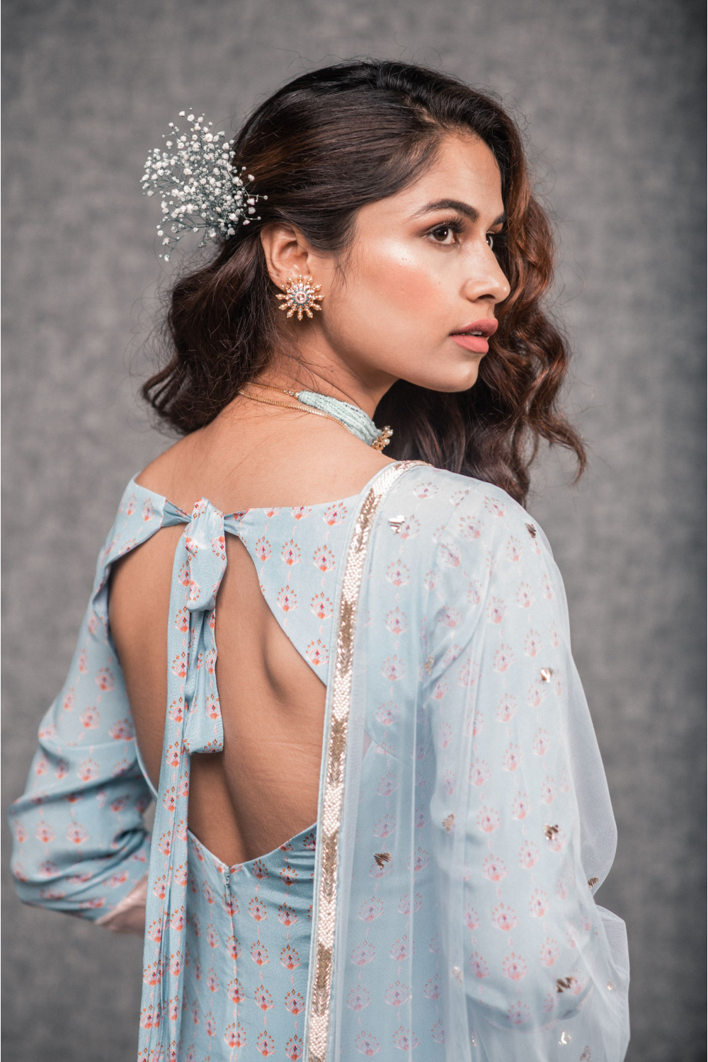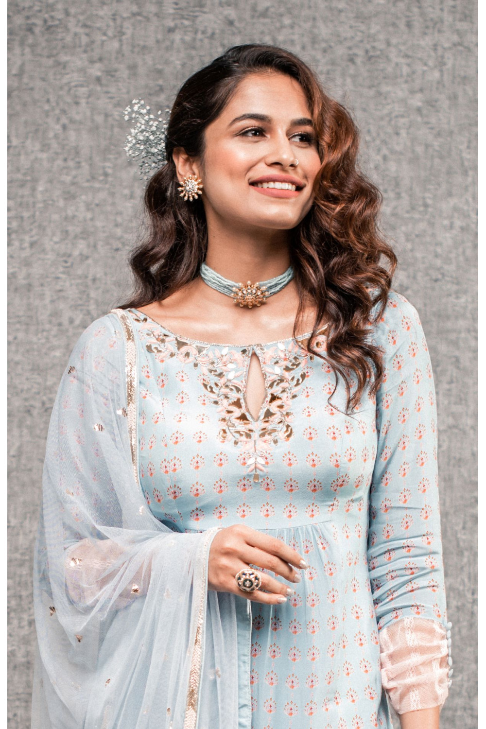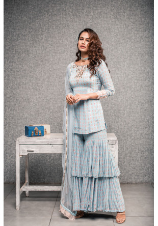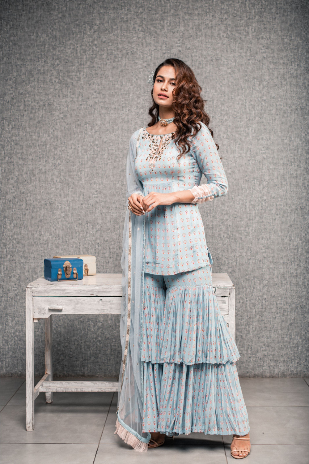 Light blue printed crepe kurta with acrylic and thread hand embroidery on the neckline with a lace detailed cuff and tie up at the back. The kurta is paired with a tiered sharara and a mukaish work dupatta with lace ruffles