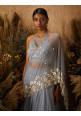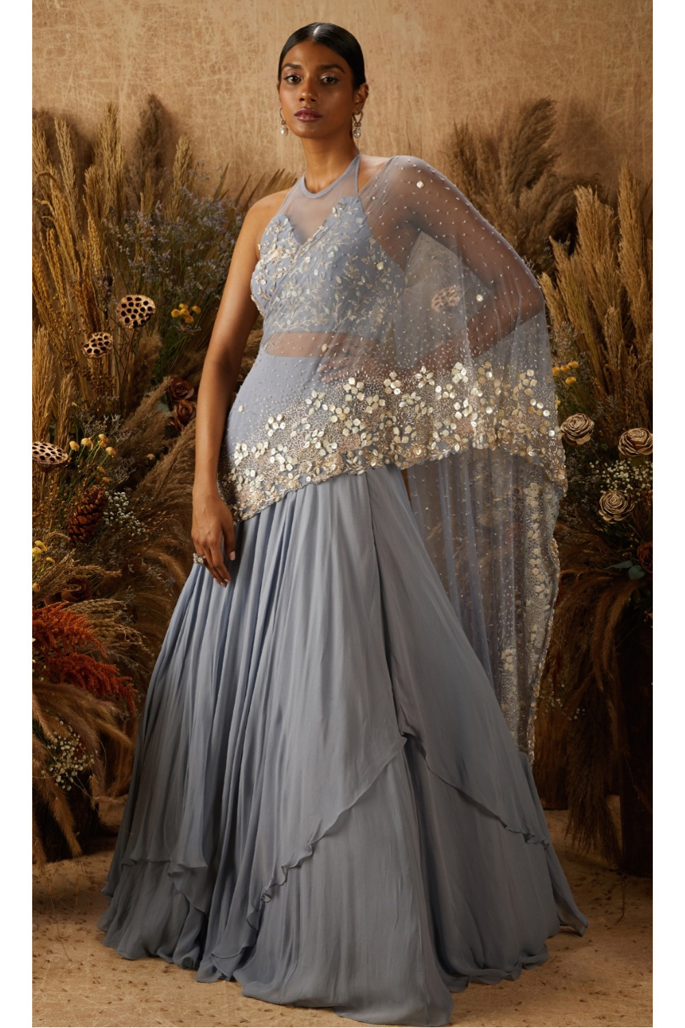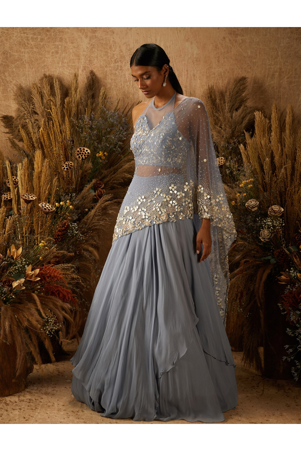 Dusty blue layered georgette lehenga with an attached hand embellished mother of pearl drape, paired with a hand embellished floral mother of pearl and zardozi cropped blouse with a tie back.