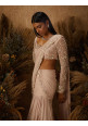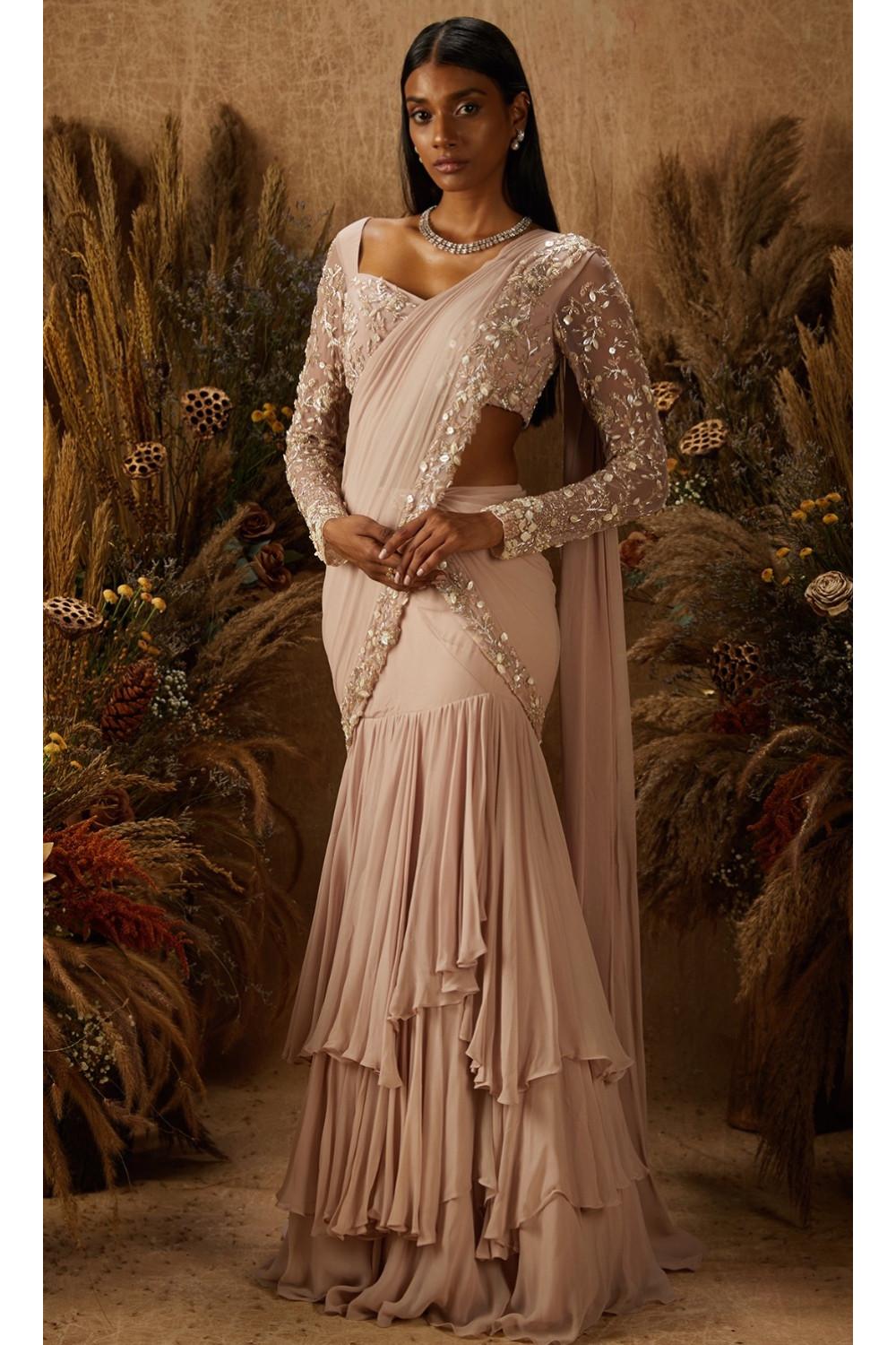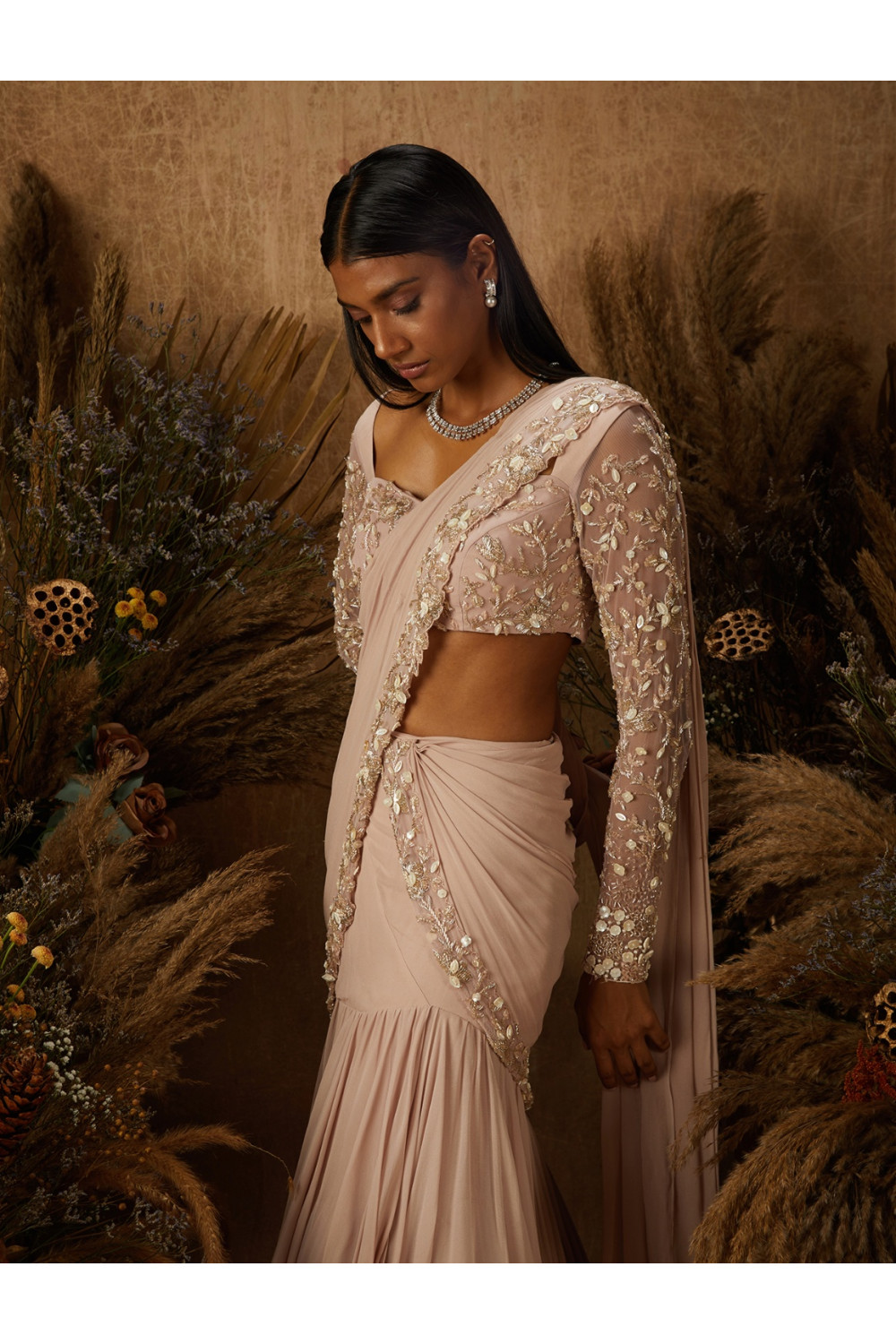 Dusty-pink layered skirt with an attached pre-draped and pre-stitched pallu featuring a hand embellished floral zardozi and mother of pearl border paired with a matching embellished blouse with a sweetheart neck and sheer sleeves, and a tie back.
