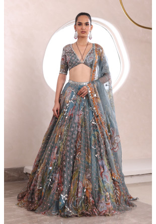 Grey organza heavily embroidered lehenga with a matching blouse and dupatta