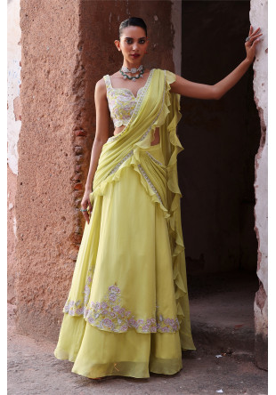 Neon green georgette choli and pre-draped organza and georgette lehenga- saree hand embroidered with.....
