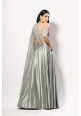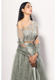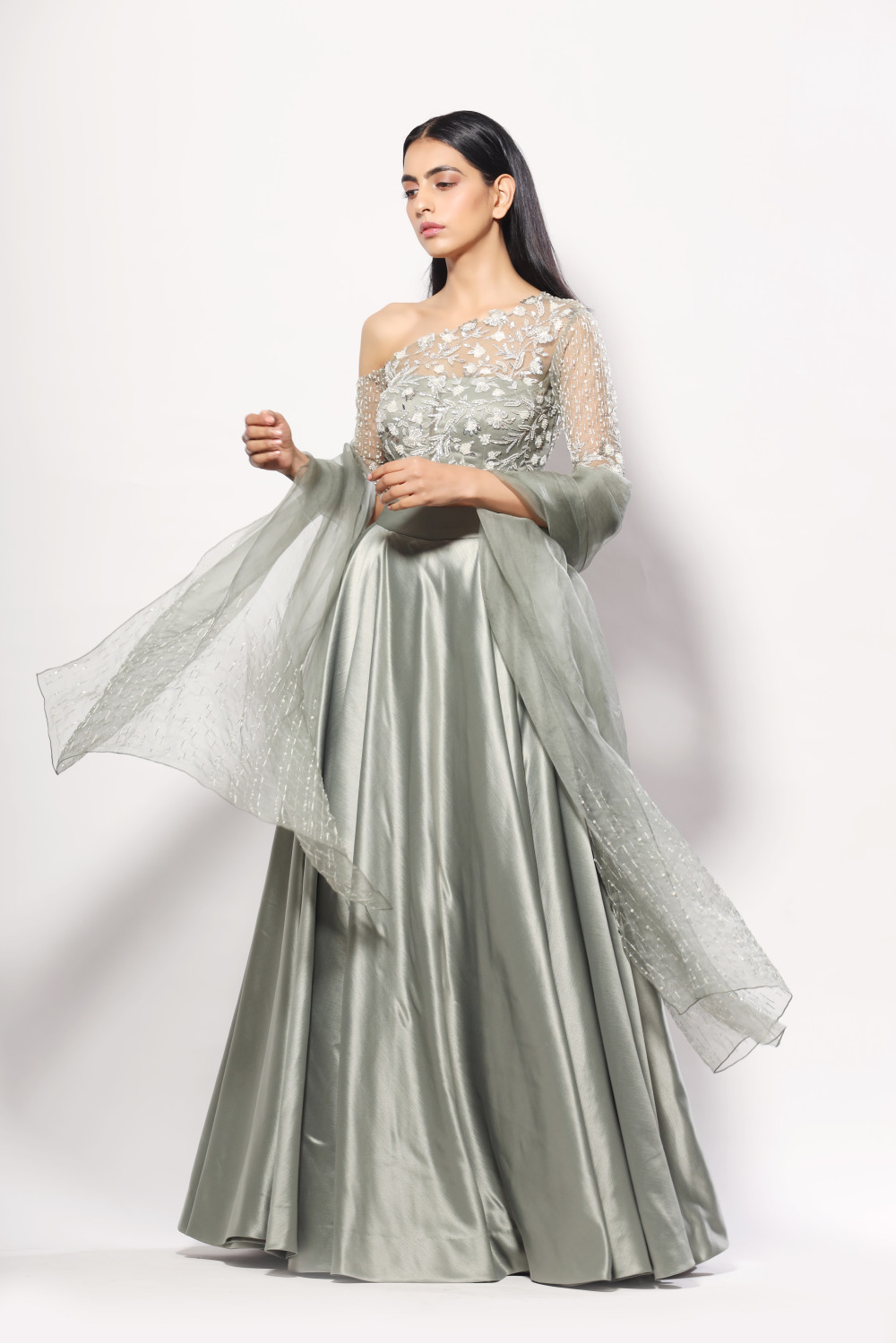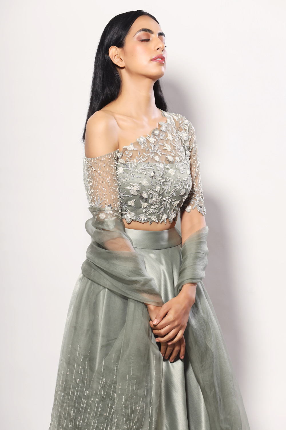 Olive asymmetric off-the-shoulder heavily embellished blouse and shantoon lehenga