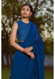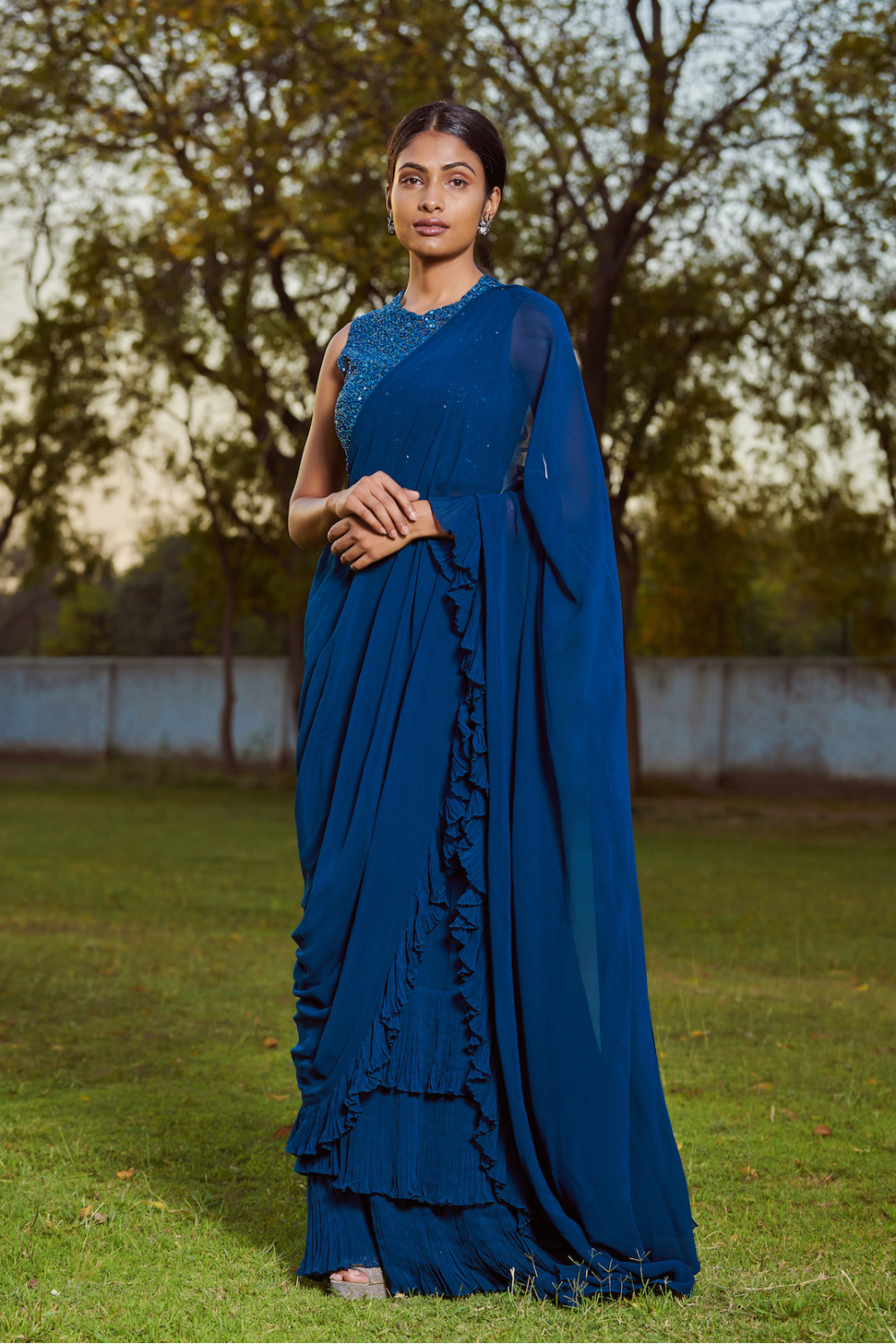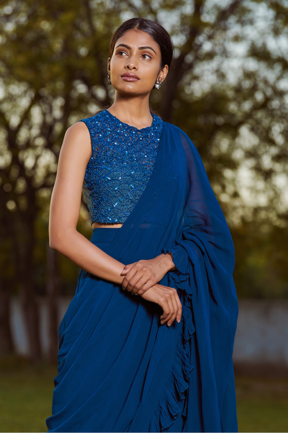 Teal blue hand embroidered blouse paired with a draped ruching detail saree