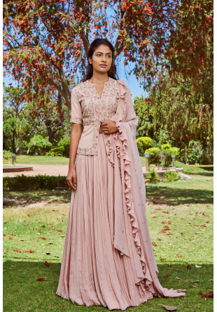 Blush embroidered peplum jacket paired with a ruched skirt and ruffled dupatta