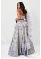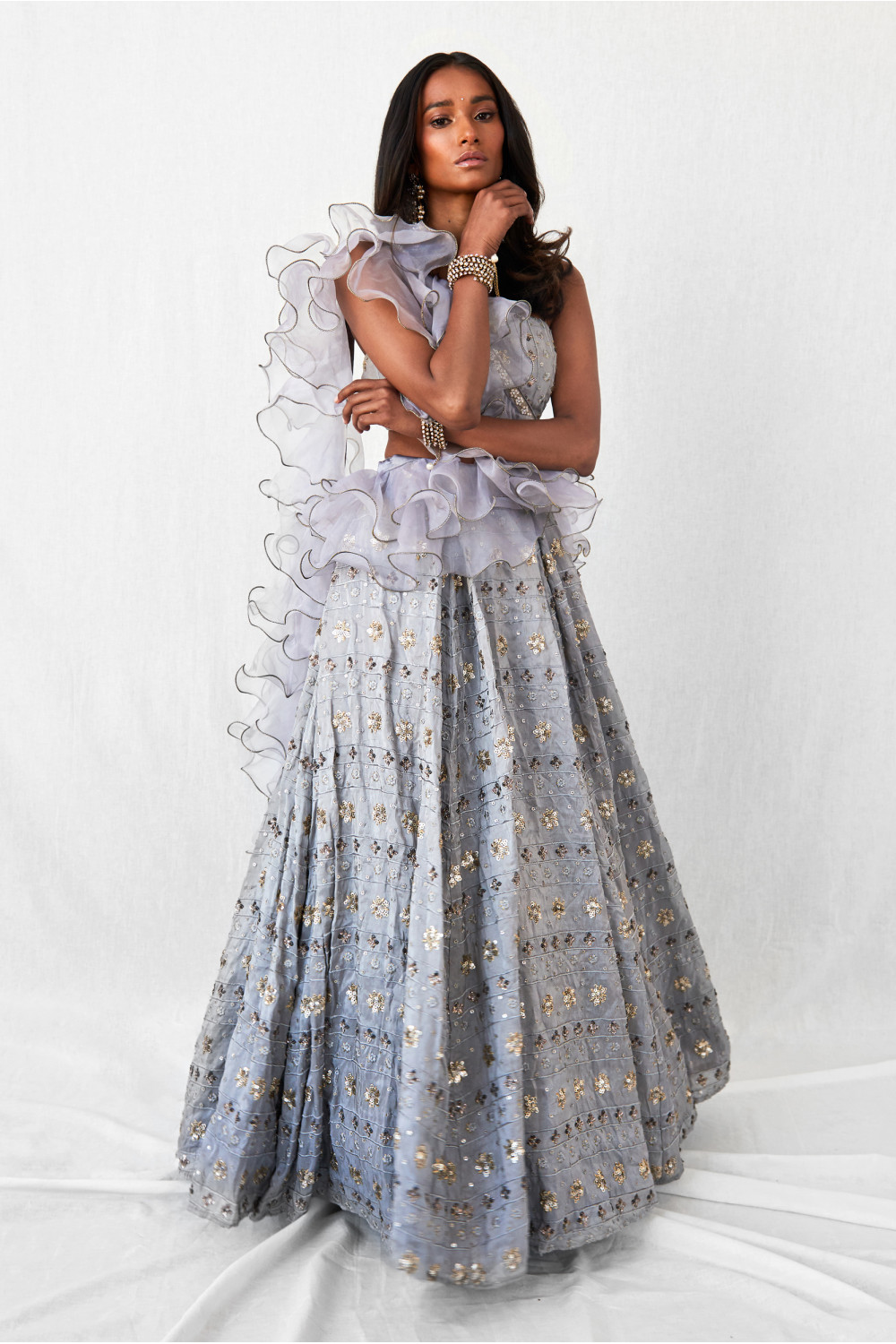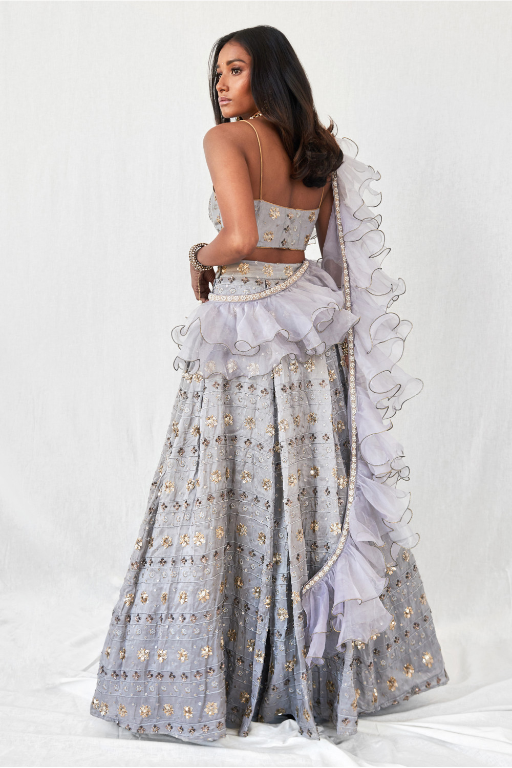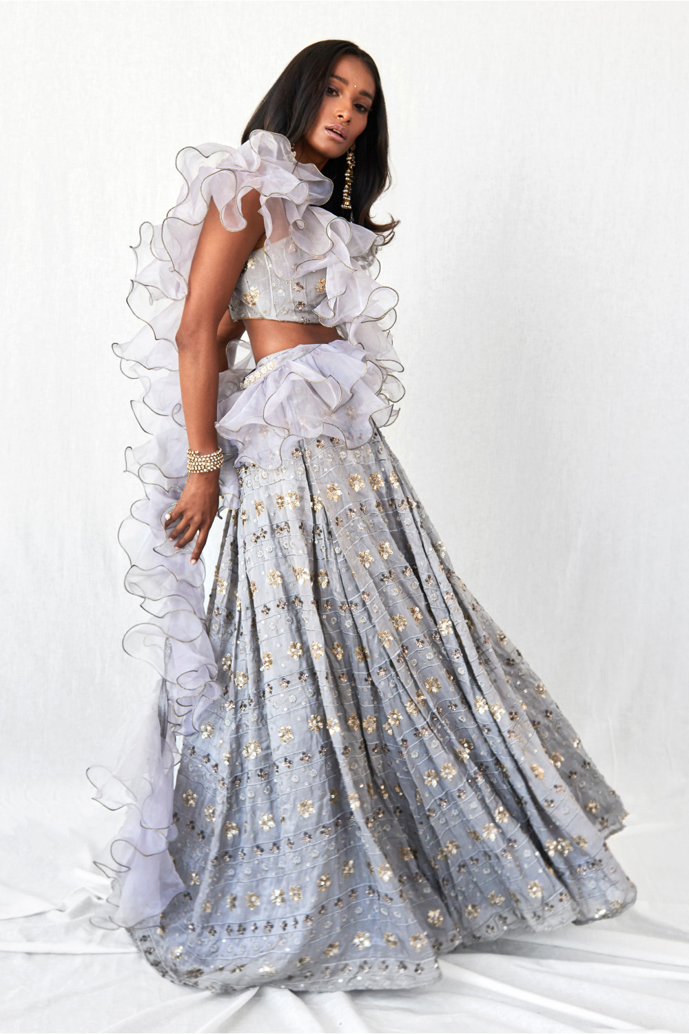 Grey uppada silk lehenga with pockets in chikan and sequin embroidery with a matching crop top and a ruffled organza dupatta with a beautiful pearl border