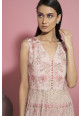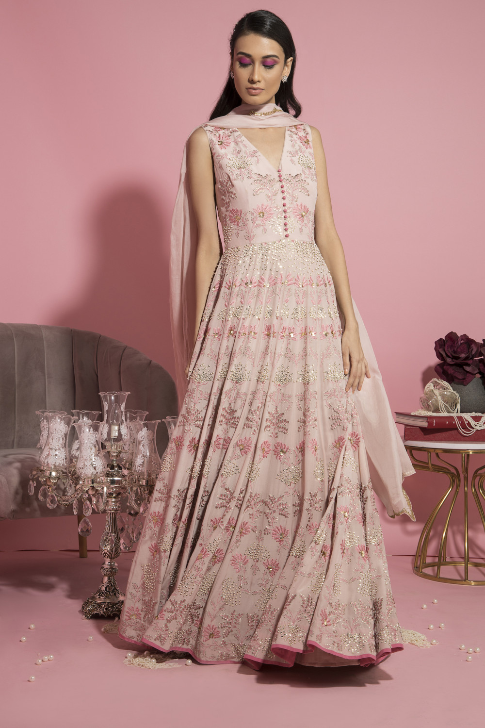 Nude pink resham embroidered anarkali in crepe and organza with signature floral sequins, dabka, pearls, and tonal cut-daana embroidery