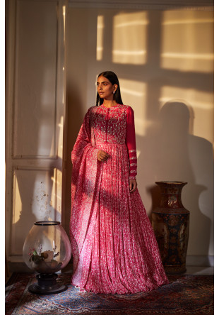 Printed georgette ruched anarkali in fuchsia with hand embroidery paired with a dupatta