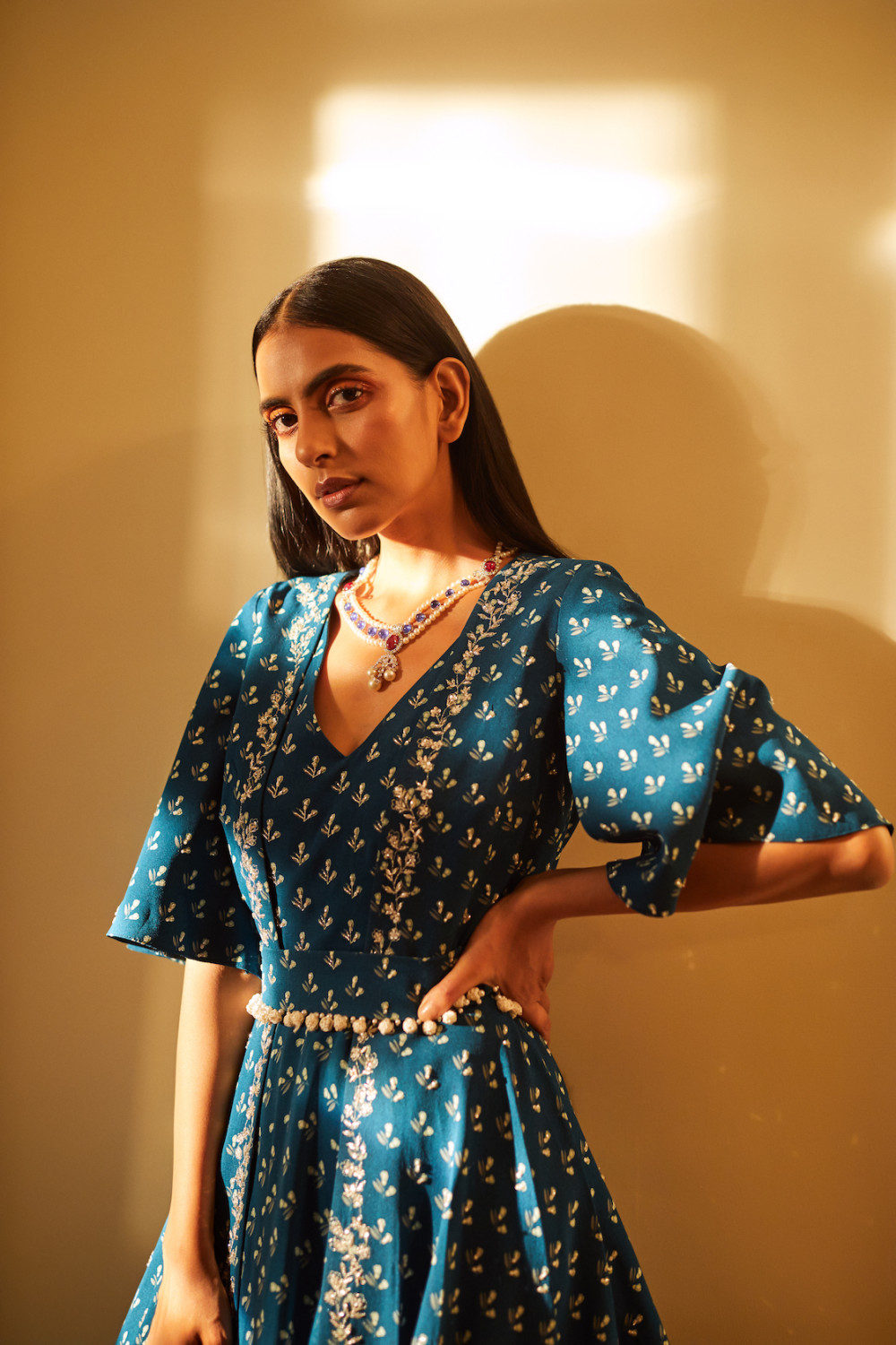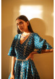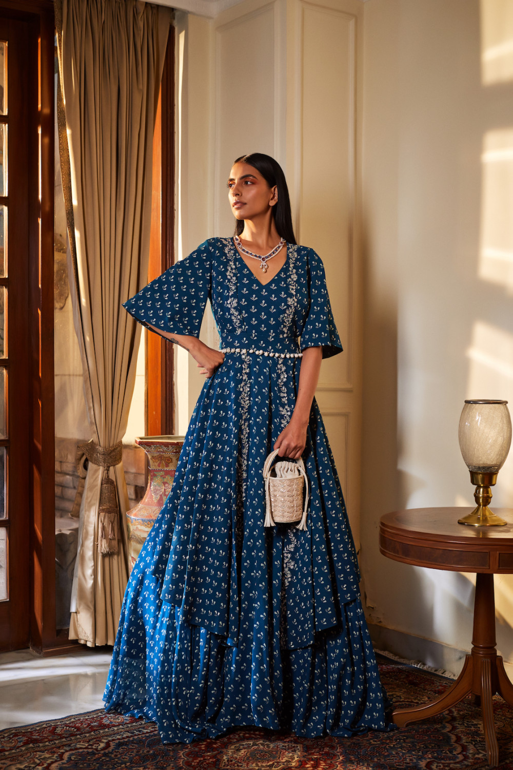 Teal blue floral bud print anarkali paired with an embroidered jacket and embroidered belt