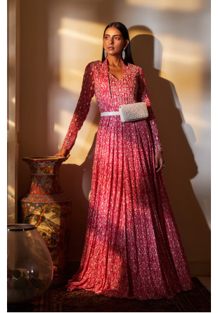 Fuchsia print anarkali with hand embroidery on the bodice paired with an attached pleated dupatta with tassel detailing