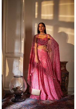 Fuchsia hand embroidered blouse paired with a printed lehenga in chanderi paired with a hand embroidered print dupatta
