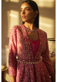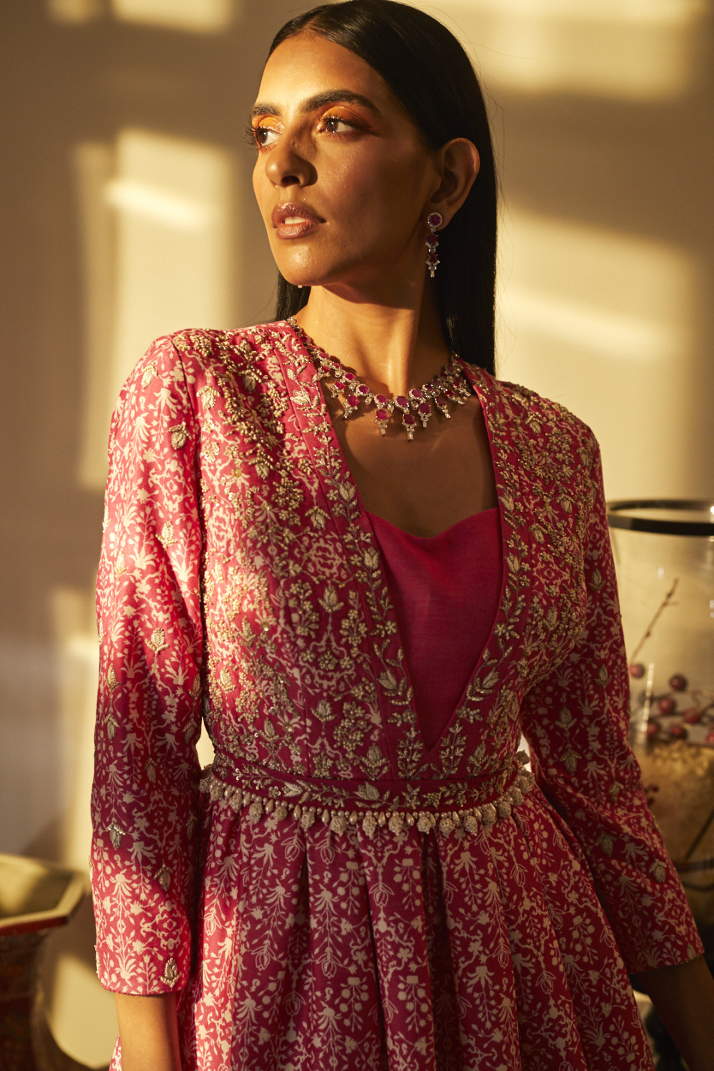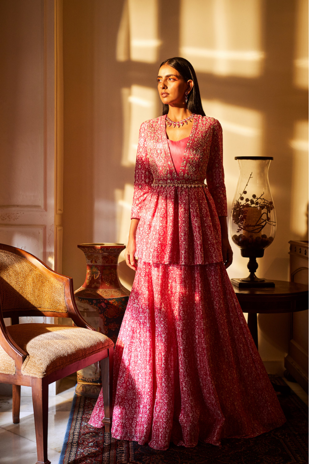 Fuchsia printed hand embroidered peplum top paired with a bustier blouse and printed lehenga in chanderi