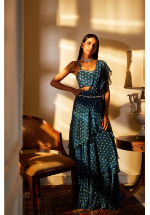 Teal blue bud print hand embroidered blouse paired with a layered pre-stitched saree in chiffon and .....