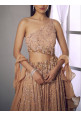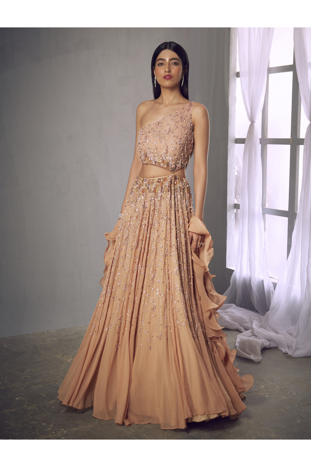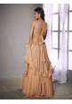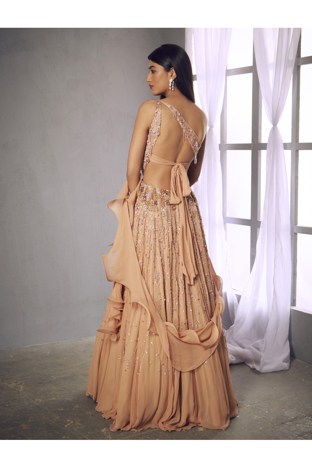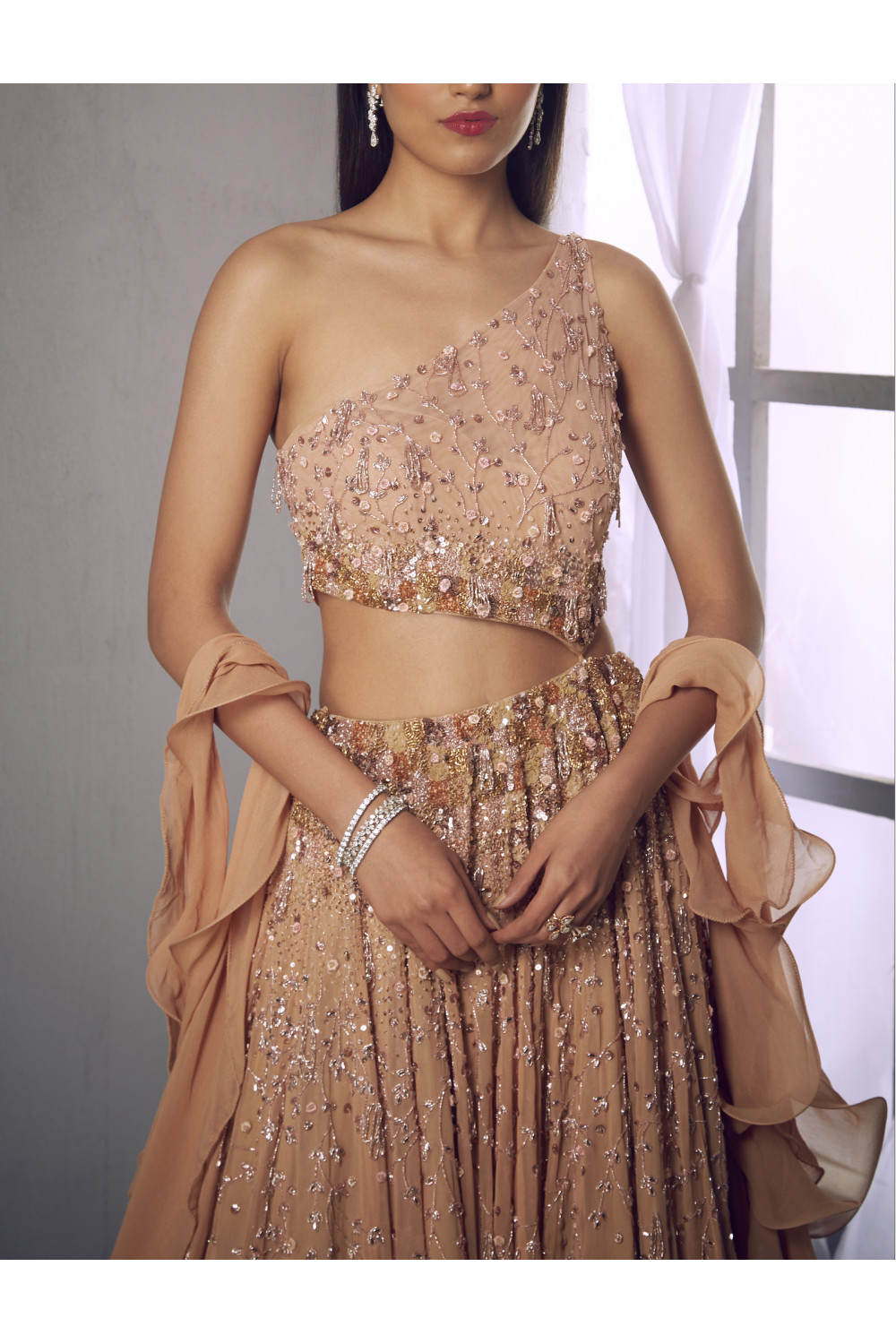 Beige gold and champgne thread flower embroidered one shoulder cut-out gown with a back tie up and a ruffle dupatta