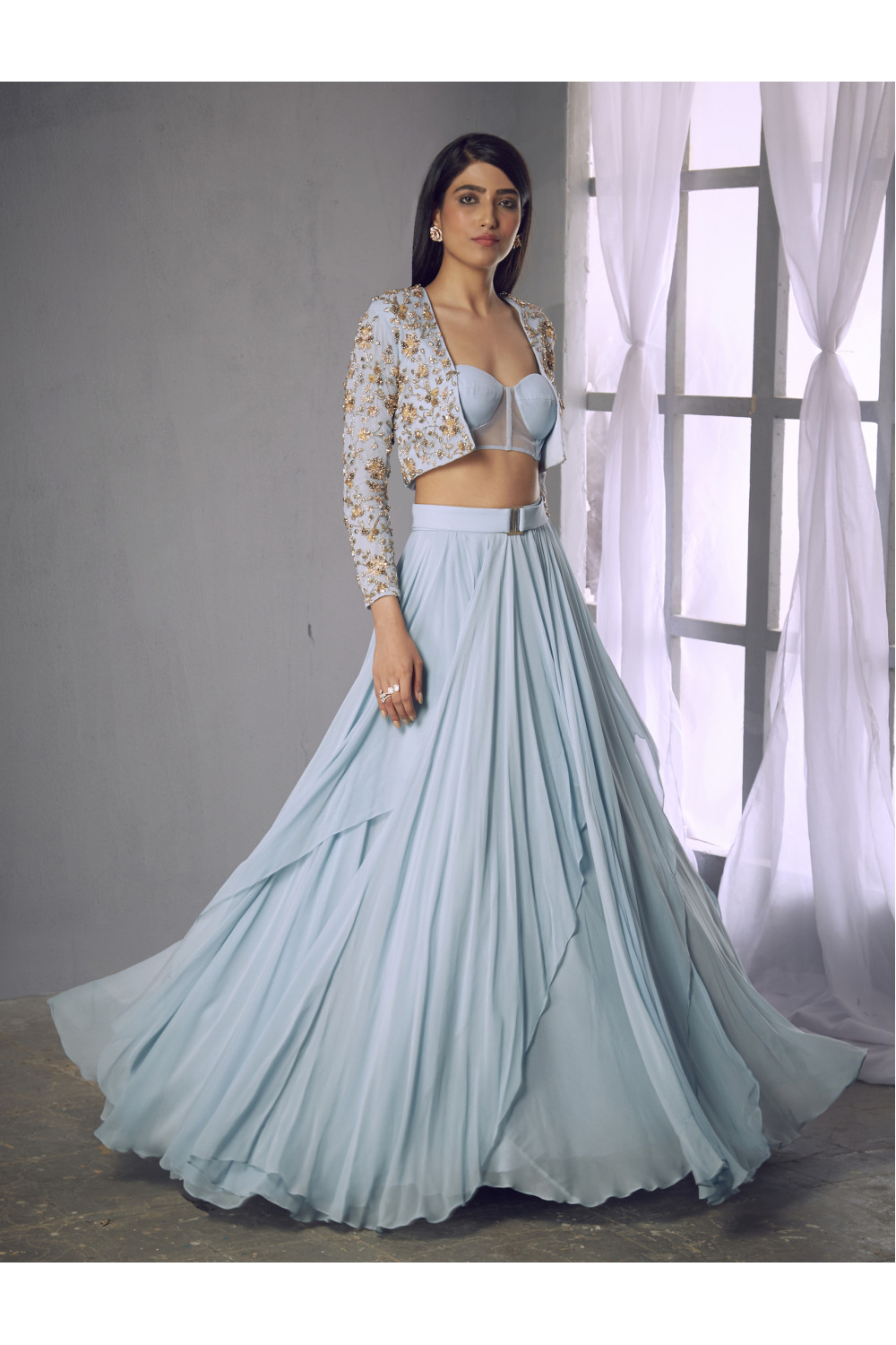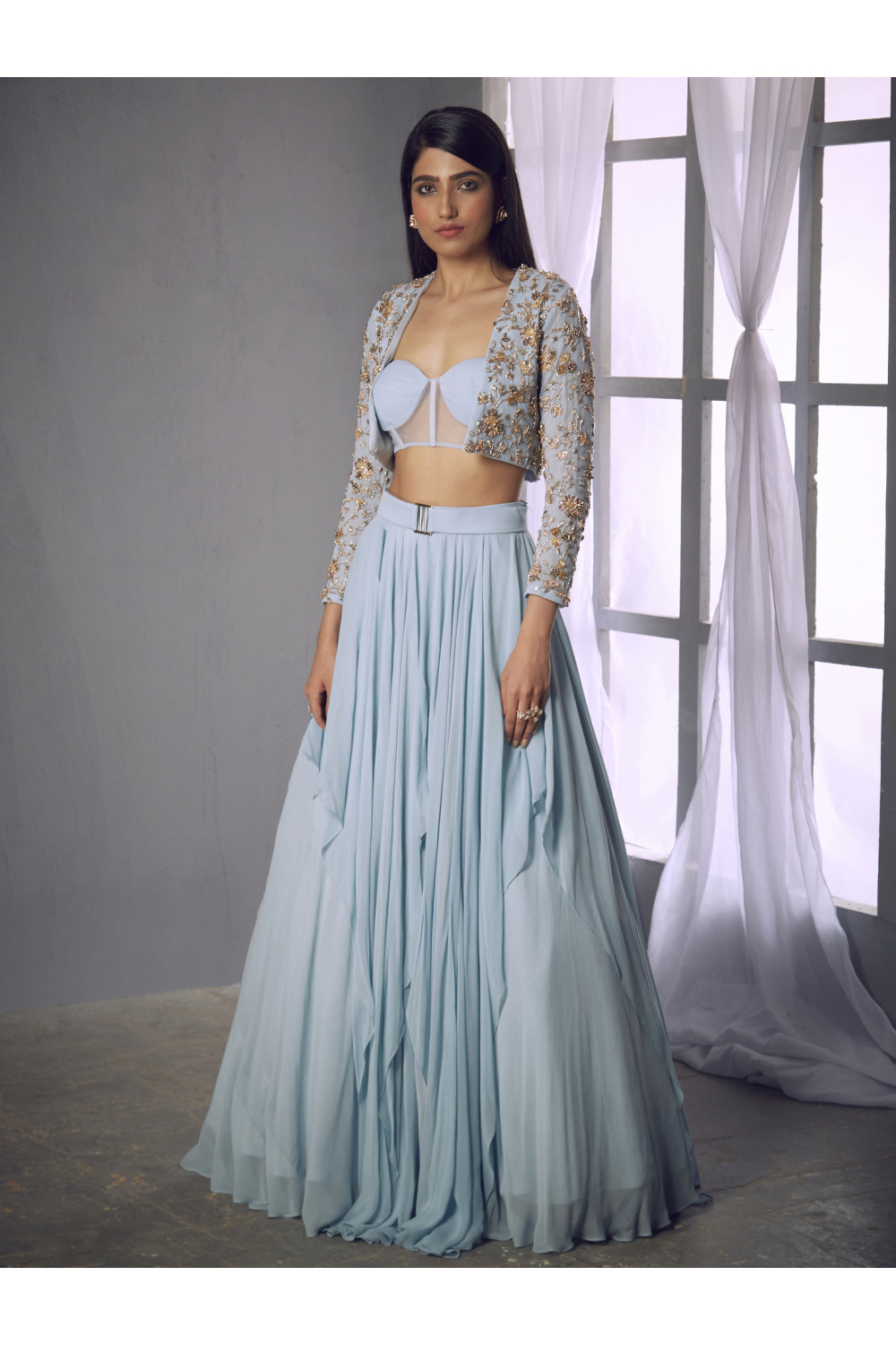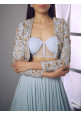 Powder-blue gold and bronze floral embellished full sleeve jacket with a powder-blue corset bustier paired with a plain georgette asymmetric layered lehenga and belt