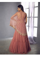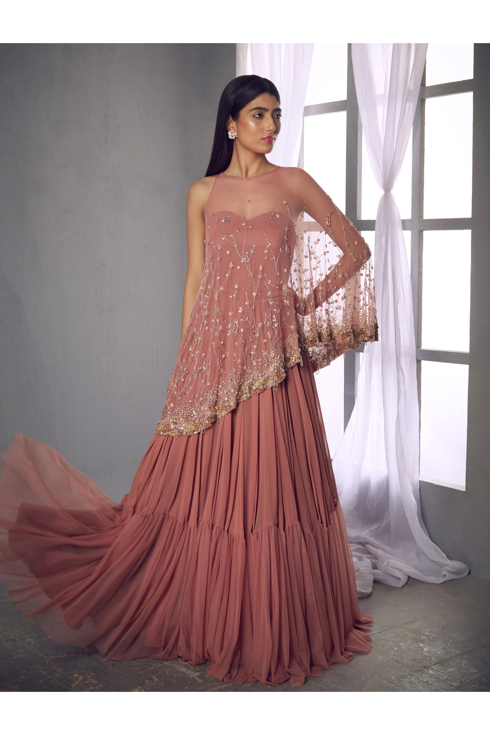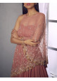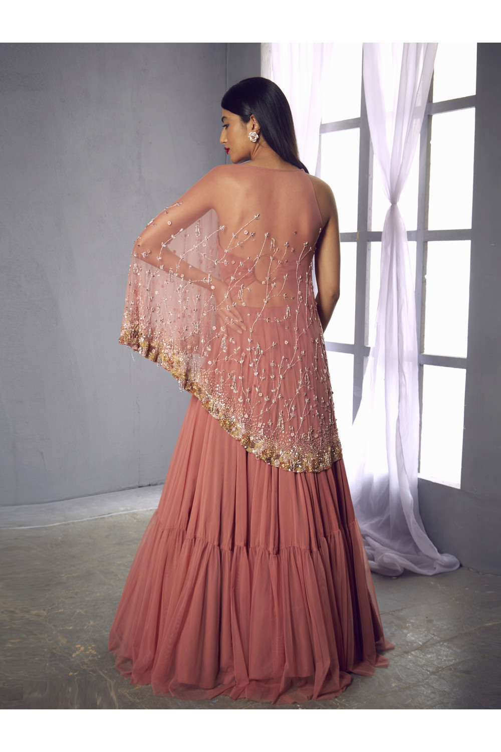 Rose-pink gold and champagne floral thread-embroidered net cape attached with a tube anarkali gown