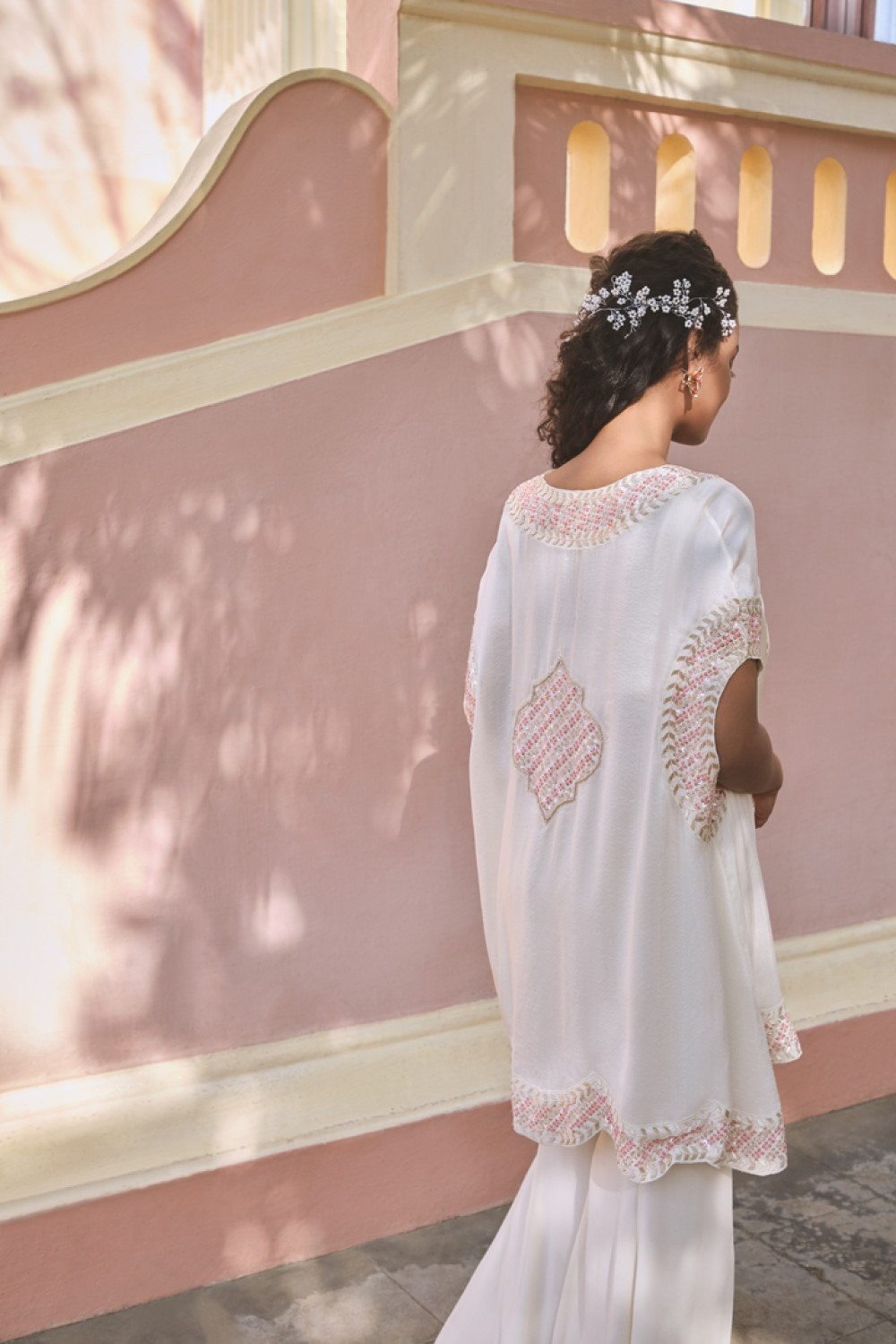 Scalloped cape paired with a bustier and flared pants in chanderi and georgette with zardosi, glassbeads and sequin hand embroidery