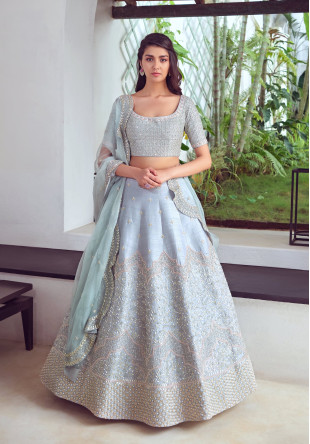 Cloud-blue raw silk lehenga paired with a matching blouse and dupatta in tulle with zardosi, glass beads, and sequin hand embroidery