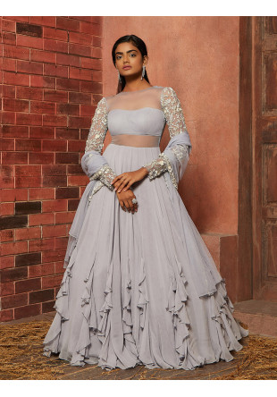 Lilac net and georgette based anarkali with sheer detailing, a ruffled hem, pearl beaded hand embellished sleeves and an embellished net dupatta