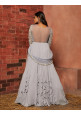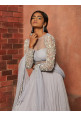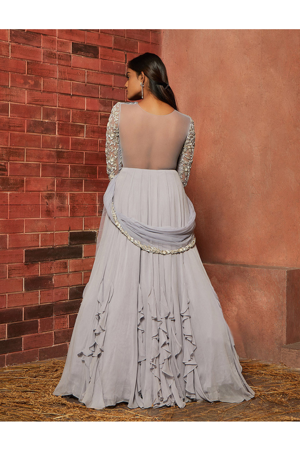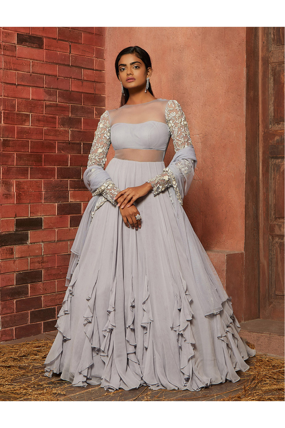 Lilac net and georgette based anarkali with sheer detailing, a ruffled hem, pearl beaded hand embellished sleeves and an embellished net dupatta