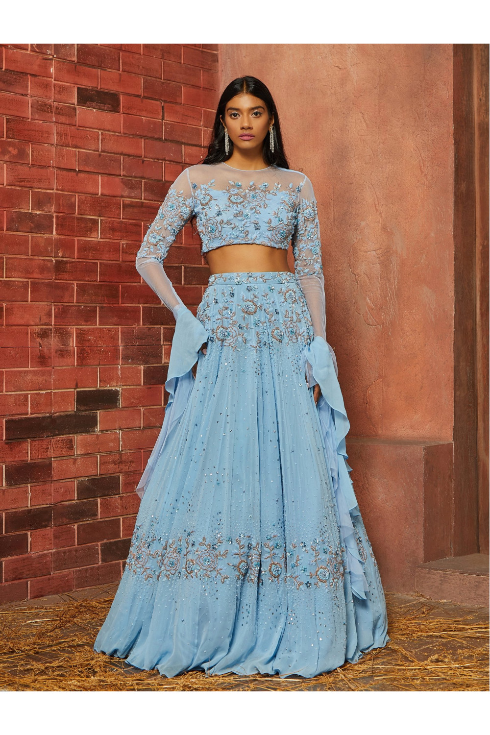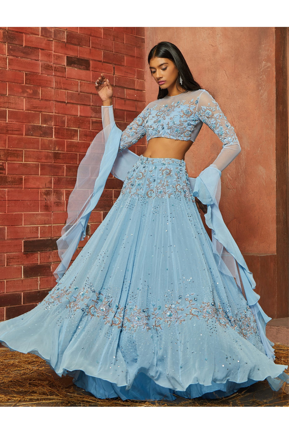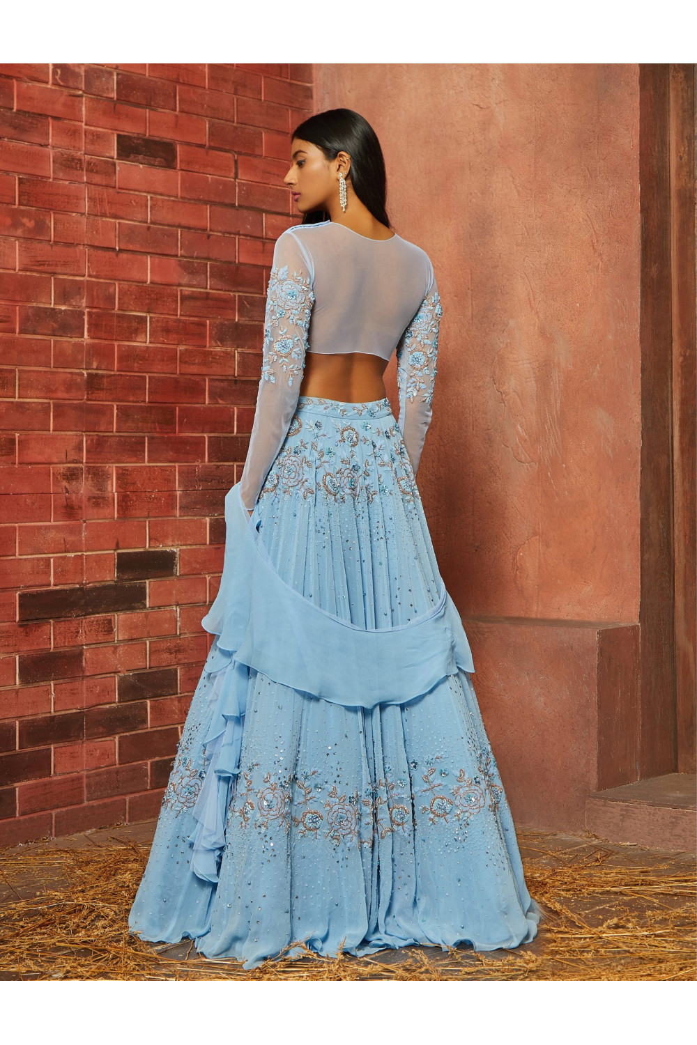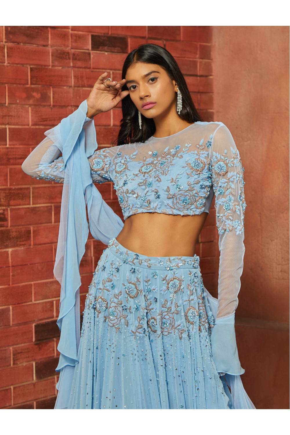 Blue, georgette lehenga featuring champagne and blue floral embellishments paired with a matching embellished net blouse and a ruffled dupatta