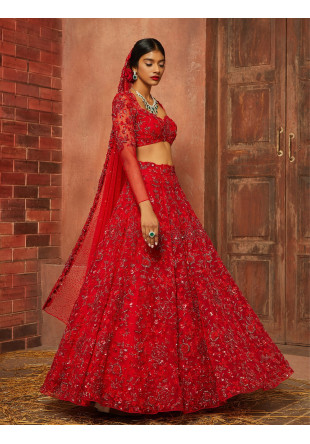 Red organza, heavily hand-embellished lehenga paired with a full sleeve embellished blouse and concept back with a net embellished dupatta