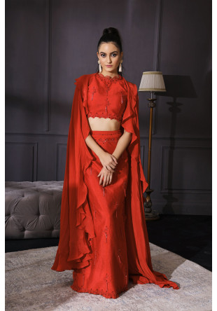 Red slit skirt set with fringes and a cape in dupion silk and crepe with hand embellished resham and seqiun