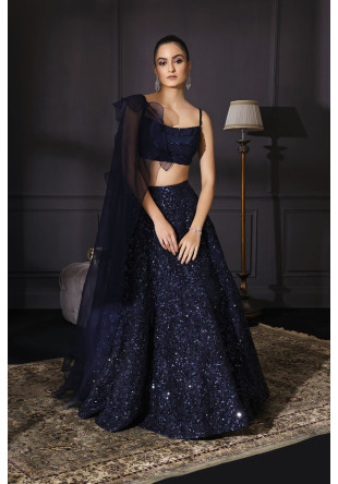Midnight blue silk organza, raw silk and net lehenga with a draped dupatta with hand embellished resham and sequin