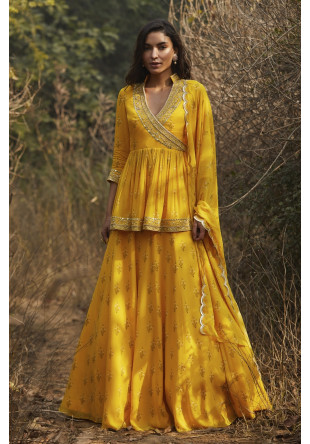 Yellow georgette lehenga with meticulous embellishments, a printed hand embroide.....