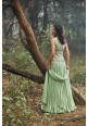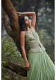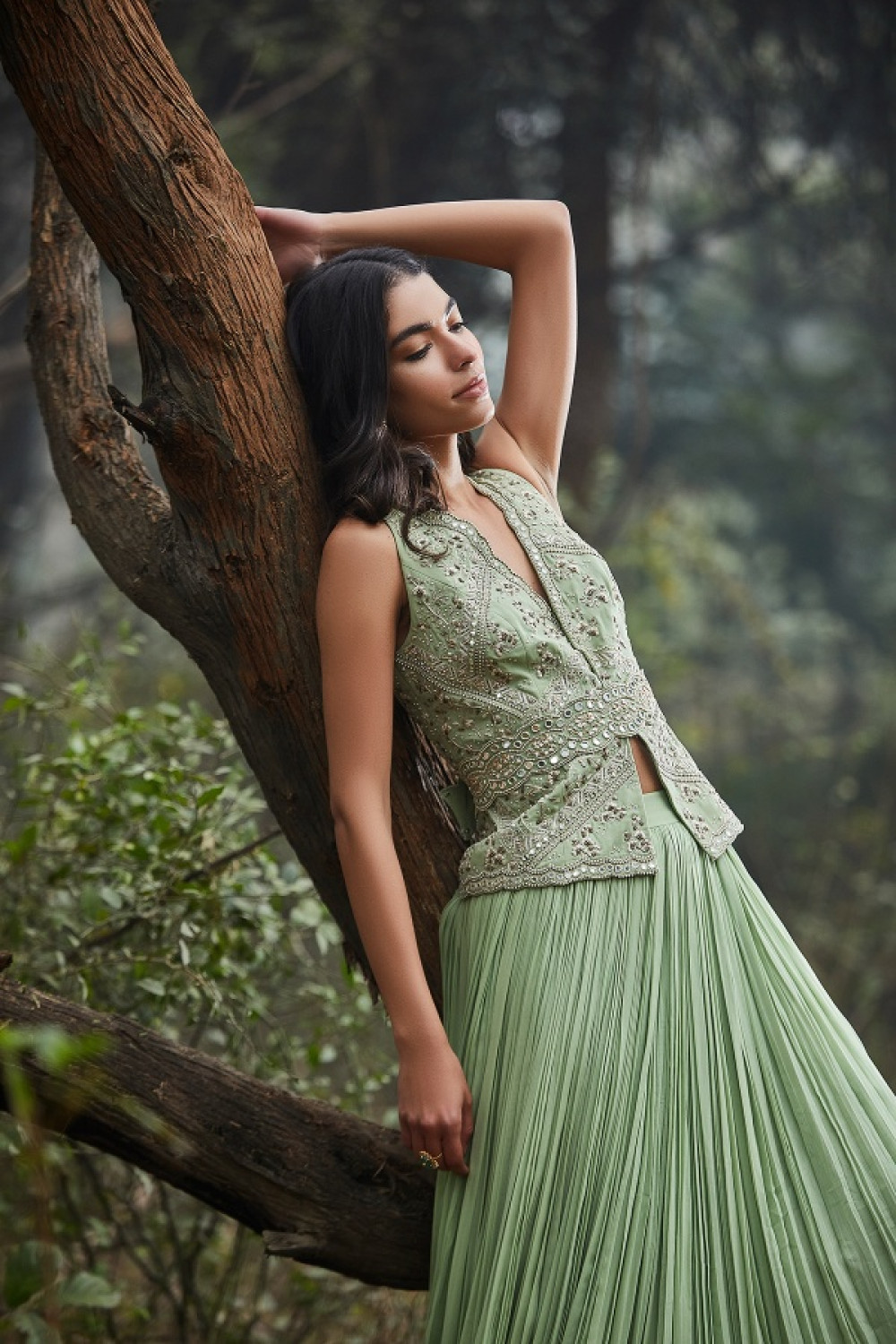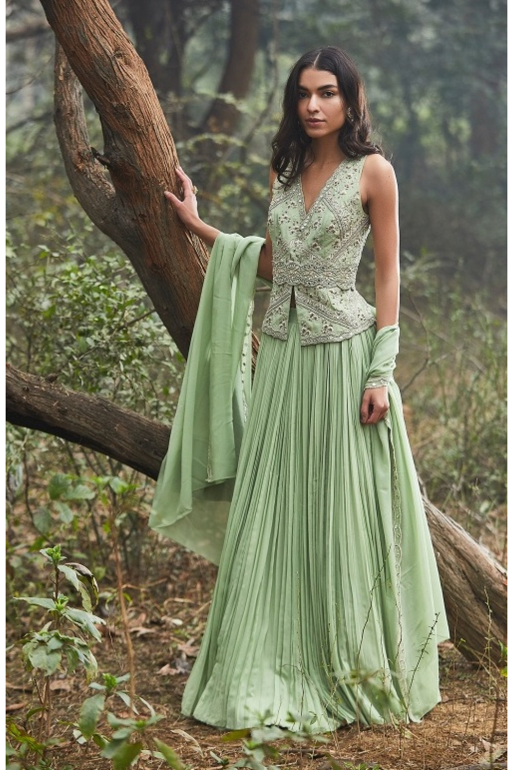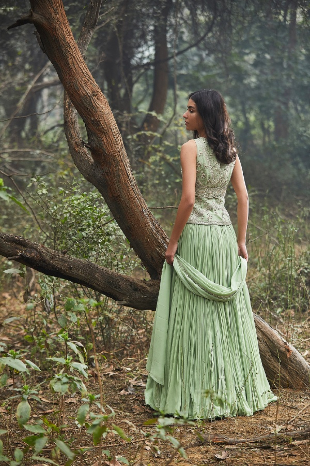 Mint green georgette lehenga paired with a hand embroidered jacket, belt and dupatta