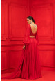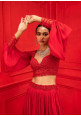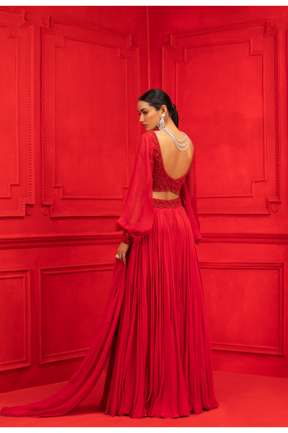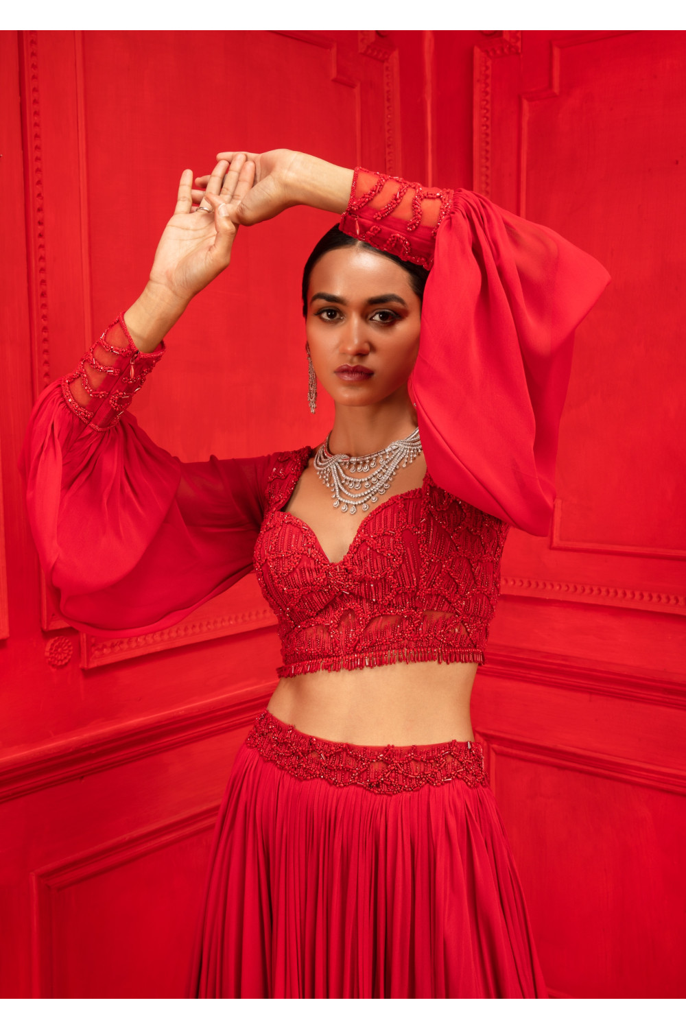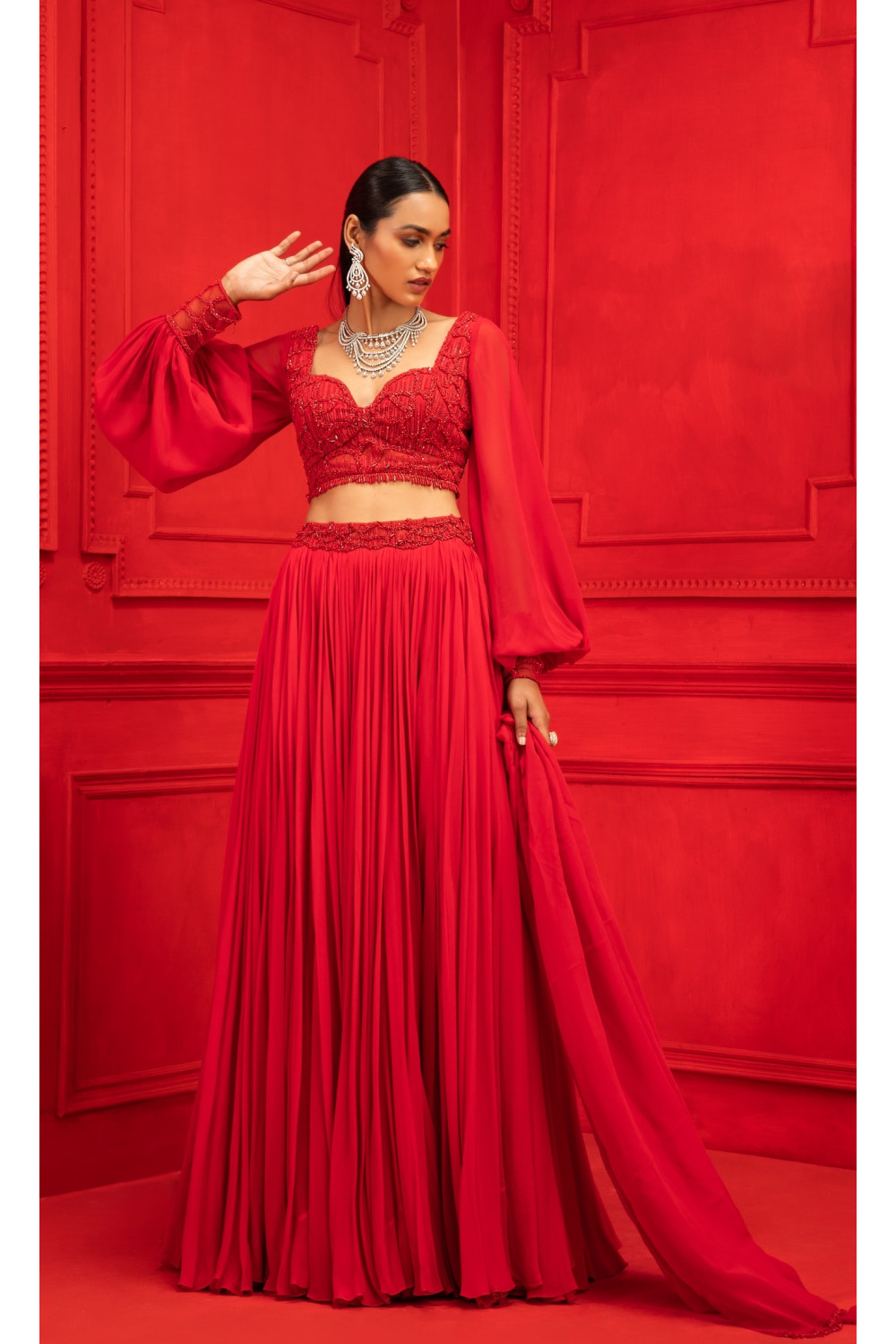 Red georgette lehenga with an embroidered belt, embroidered blouse and a georgette dupatta with tassels