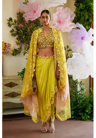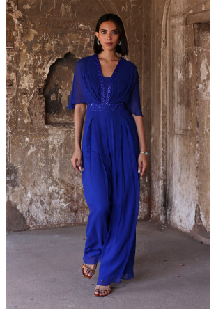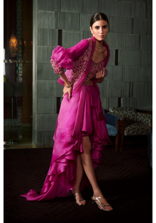 Fuchsia layered gown with an embroidered jacket in crepe, net and organza