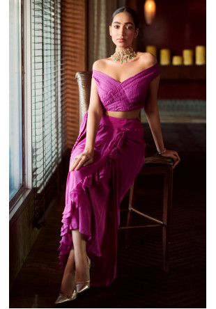 Fuchsia ruffled draped skirt with an off-the-shoulder pleated blouse in organza and crepe.....