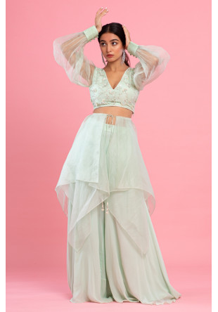 Mint-green peplum top in organza with 3D embroidery in glass beads, sequin and pearl with palazzo pants in double georgette with a draped organza overlay