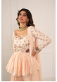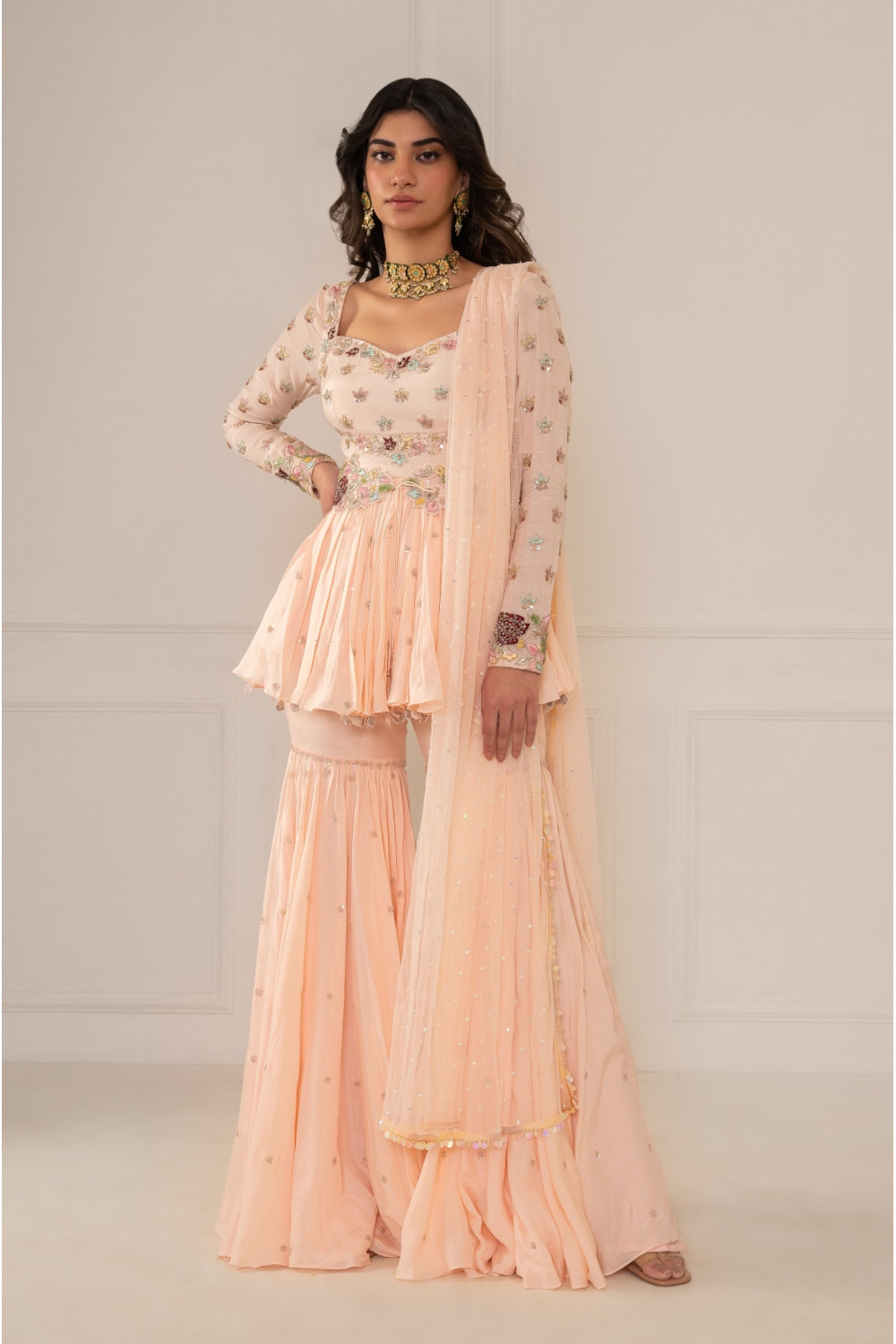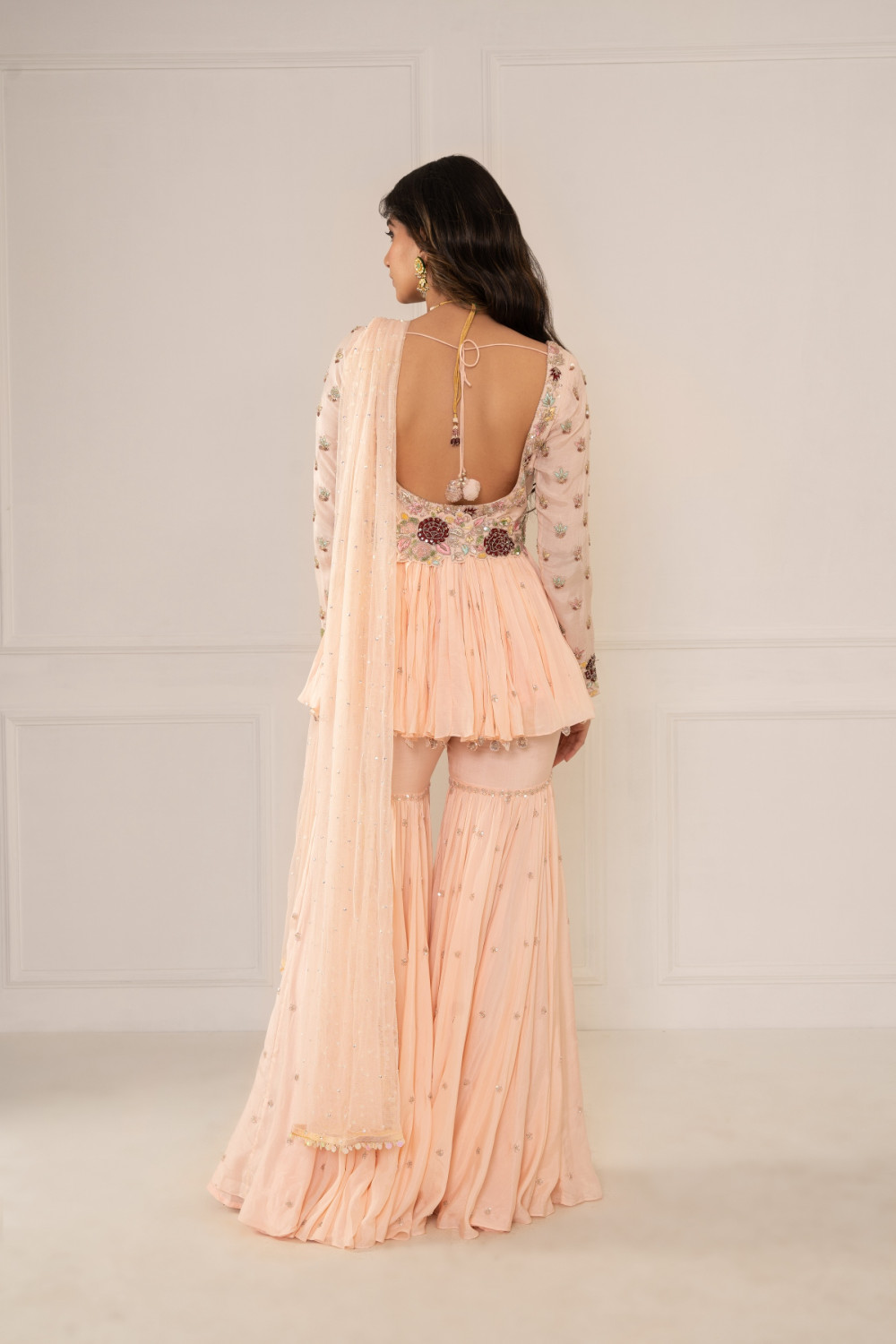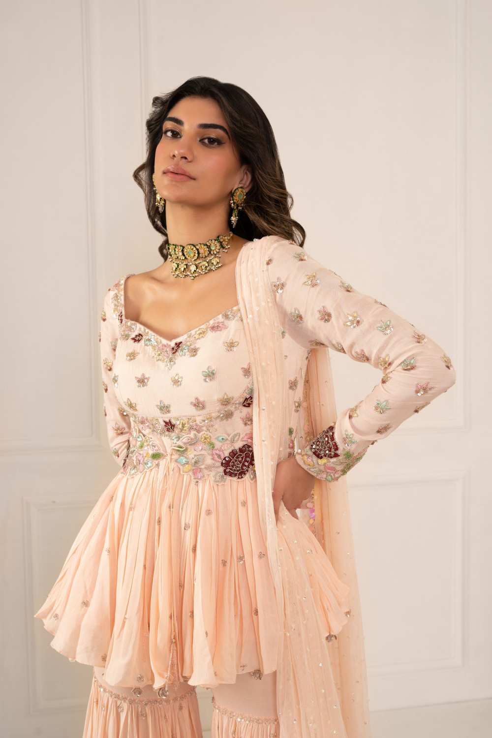 Tea pink peplum and gharara set with a belt and dupatta in cotton-silk and net with zardosi hand embroidery