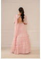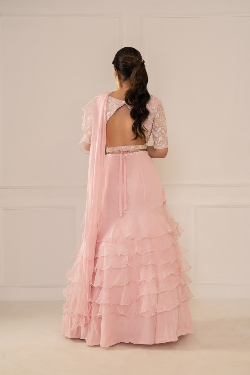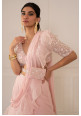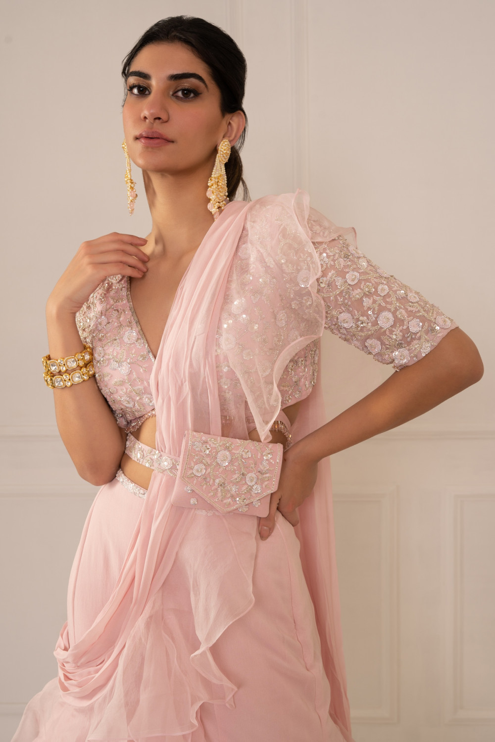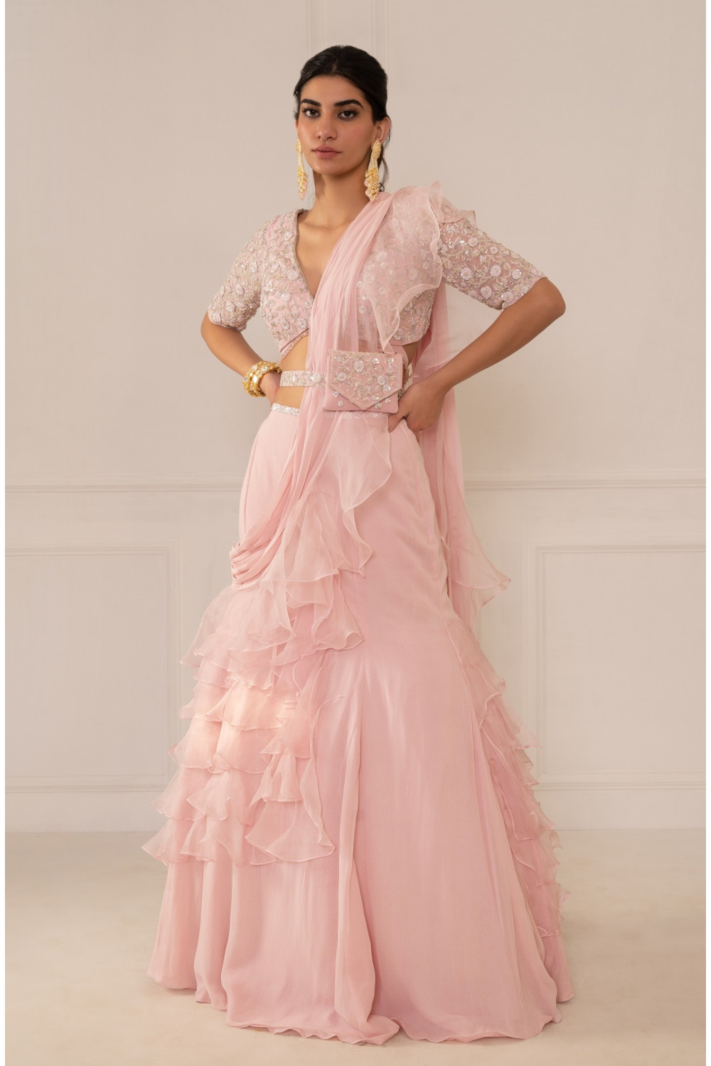 Pirouette pink ruffle saree with a blouse, in organza and georgette with a belt-bag with zardosi hand embroidery