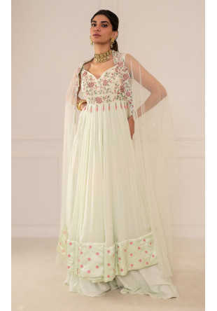 Mint green anarkali set with palazzo pants and a cape-style dupatta in cotton silk and net with zardosi hand embroidery