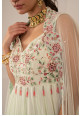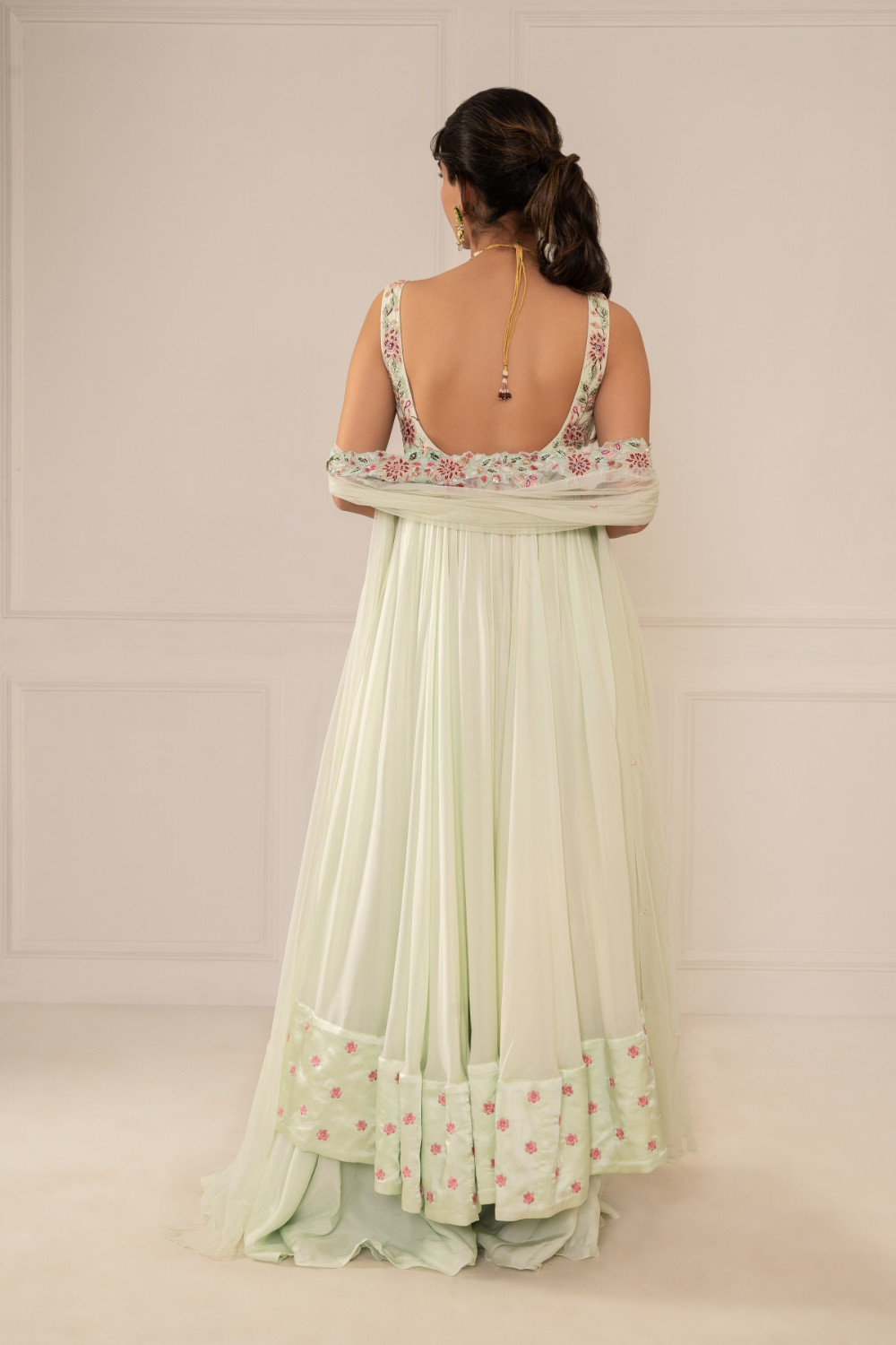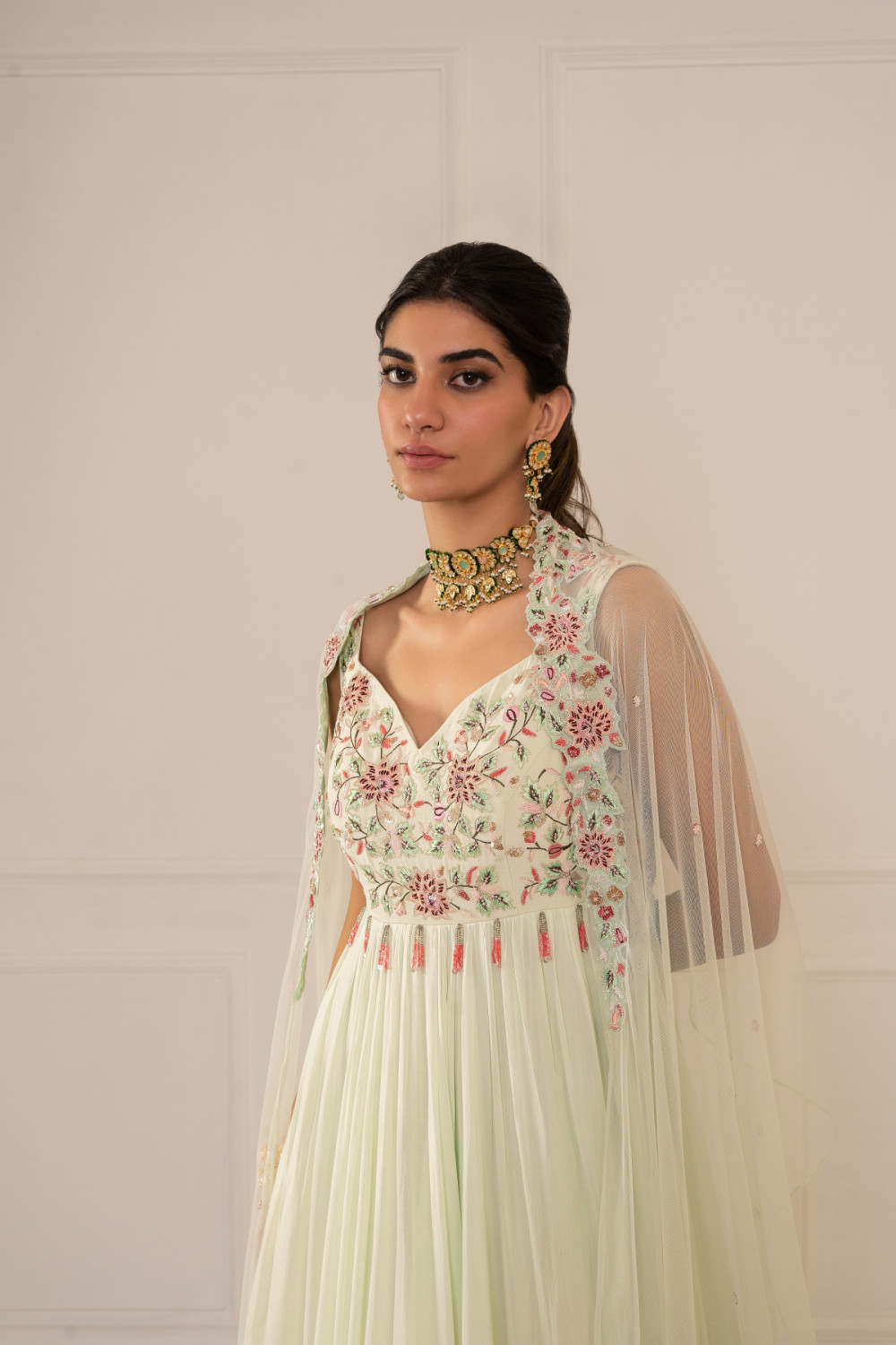 Mint green anarkali set with palazzo pants and a cape-style dupatta in cotton silk and net with zardosi hand embroidery