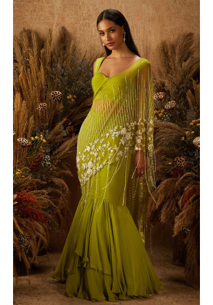 Light green layered fishtail crepe lehenga with an attached hand embellished drape featuring floral white rafia work and hand beaded tassels, paired with a structured pleated corset crop top.
